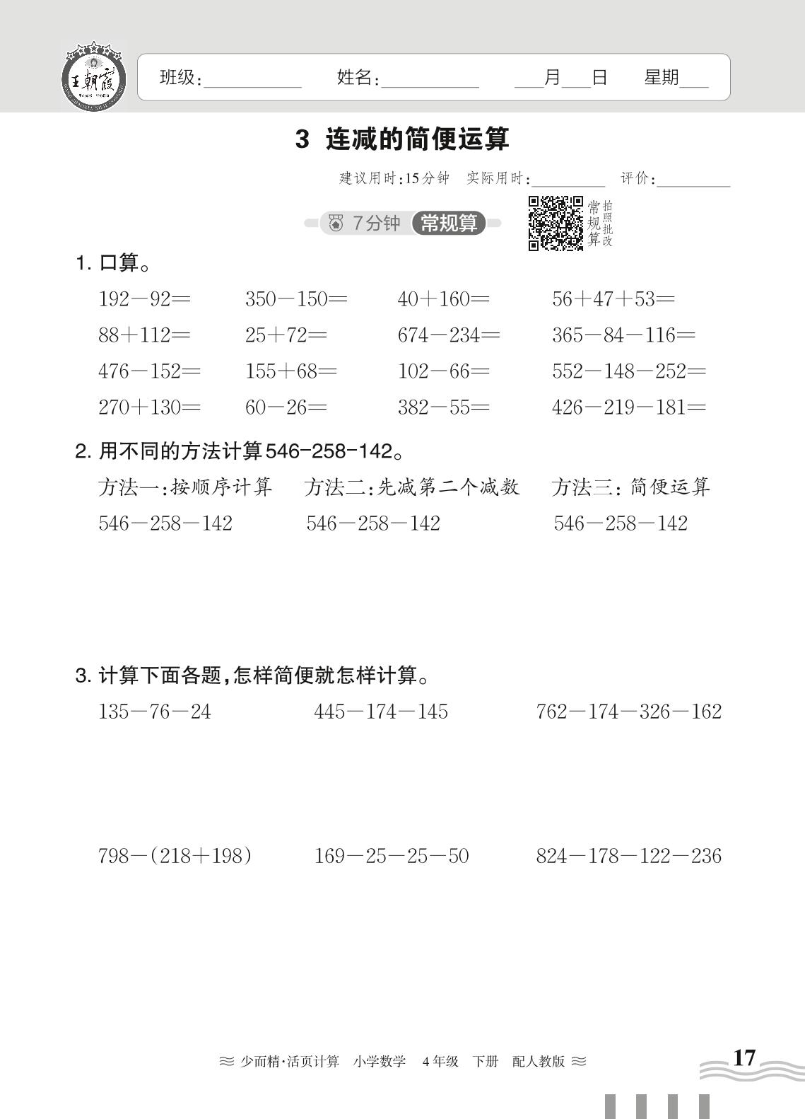 2024春下册四年级数学人教版 第三单元 运算律——3. 连减的简便运算_R240124111813543