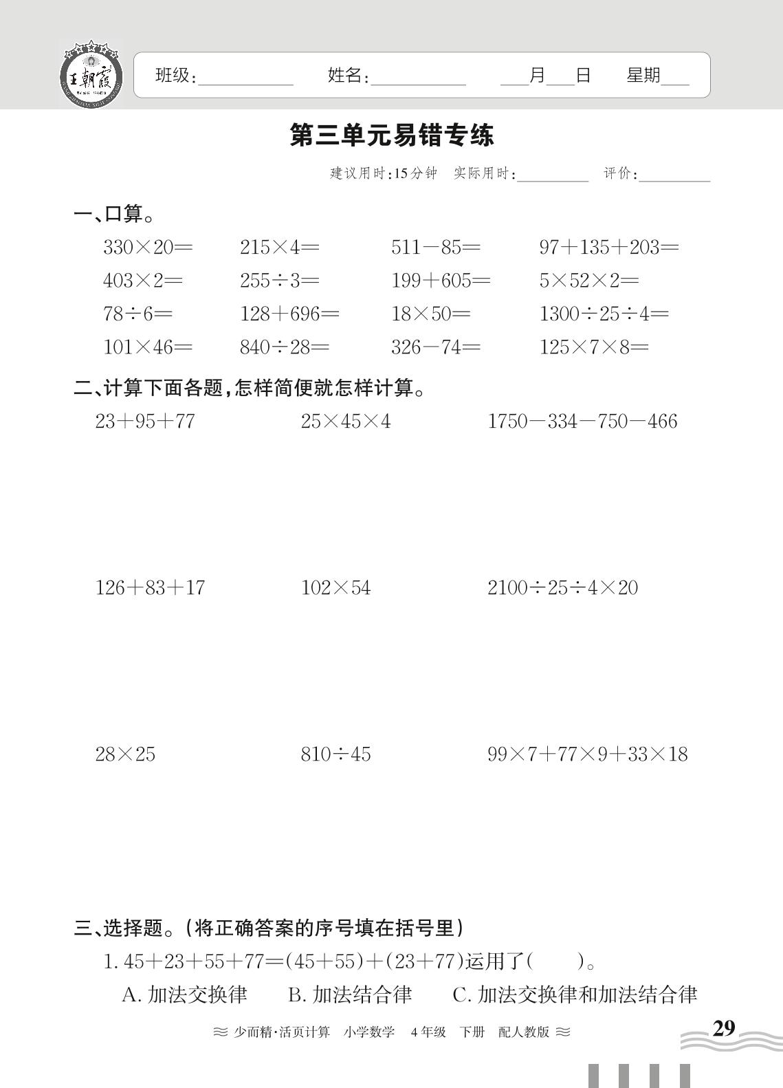 四年级数学人教版下册专项卷