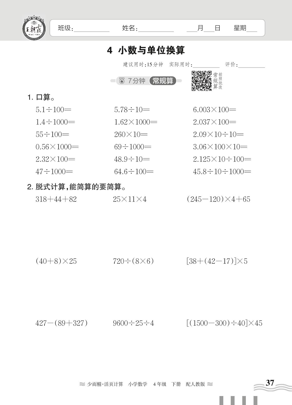 2024春下册四年级数学人教版 第四单元 小数的意义和性质——4. 小数与单位换算