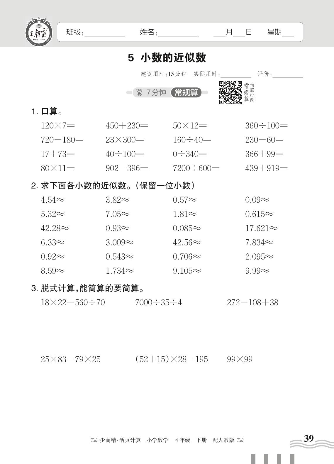 2024春下册四年级数学人教版 第四单元 小数的意义和性质——5. 小数的近似数