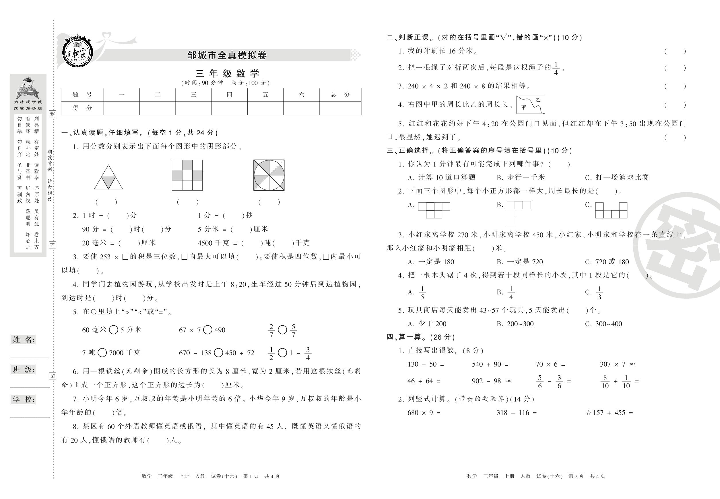 2016-2017学年第一学期邹城市三年级数学试卷(人教版)【16】