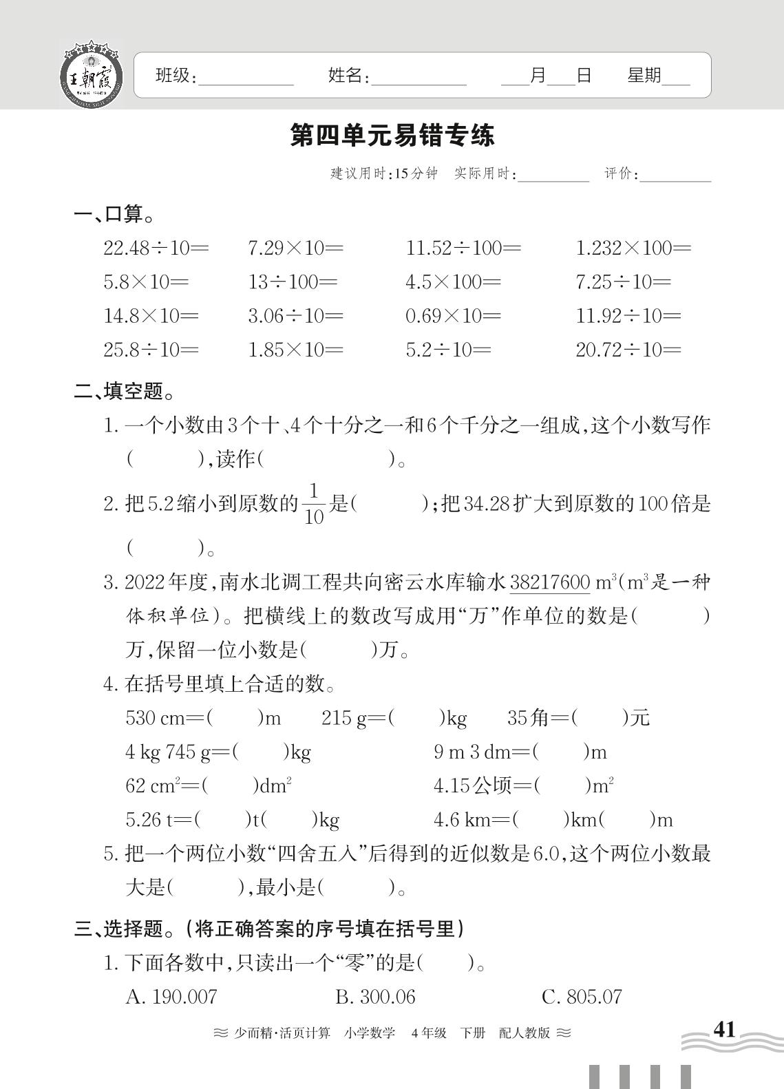 四年级数学人教版下册专项卷