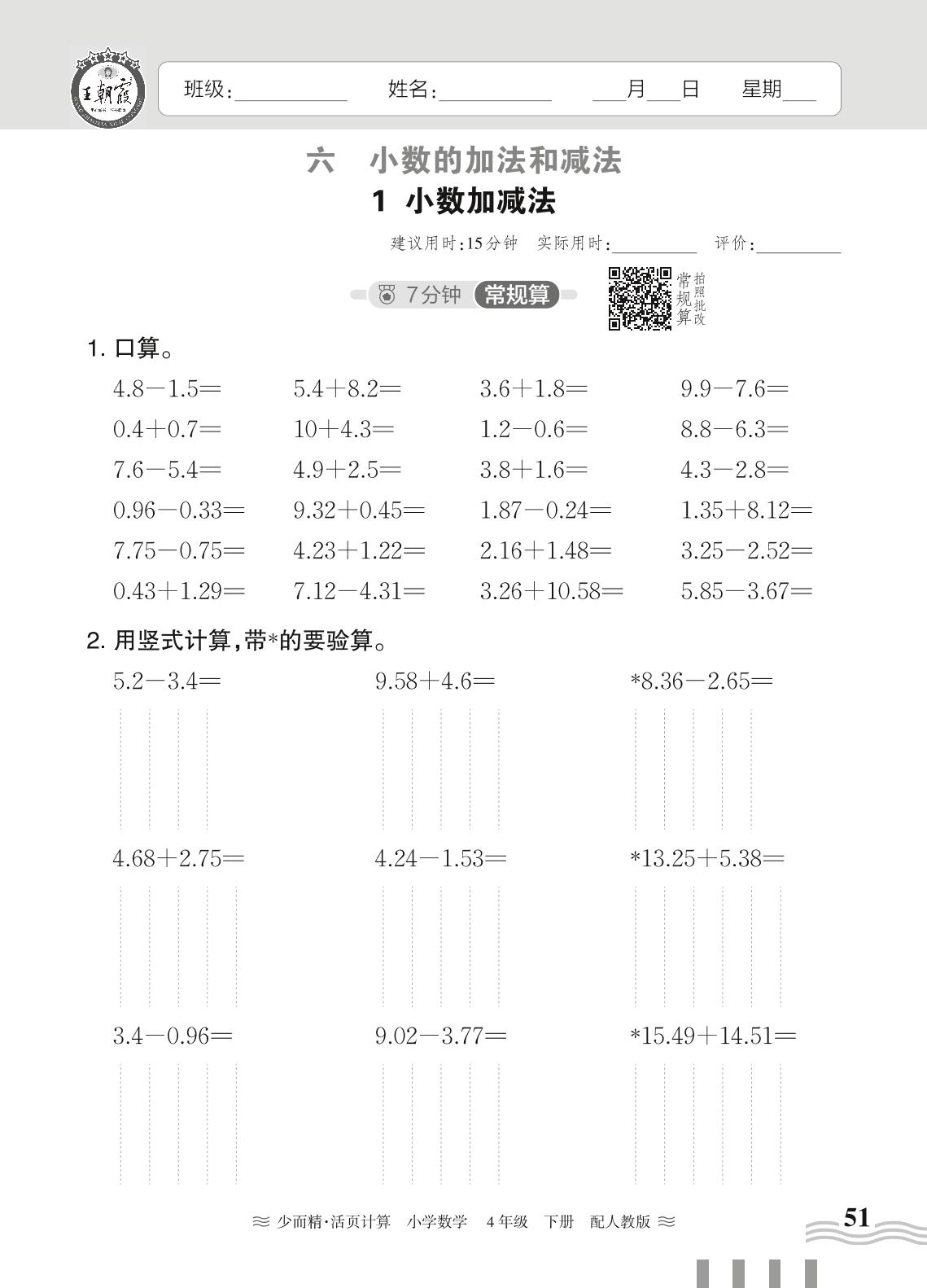 2024春下册四年级数学人教版 第六单元 小数的加法和减法——1. 小数加减法