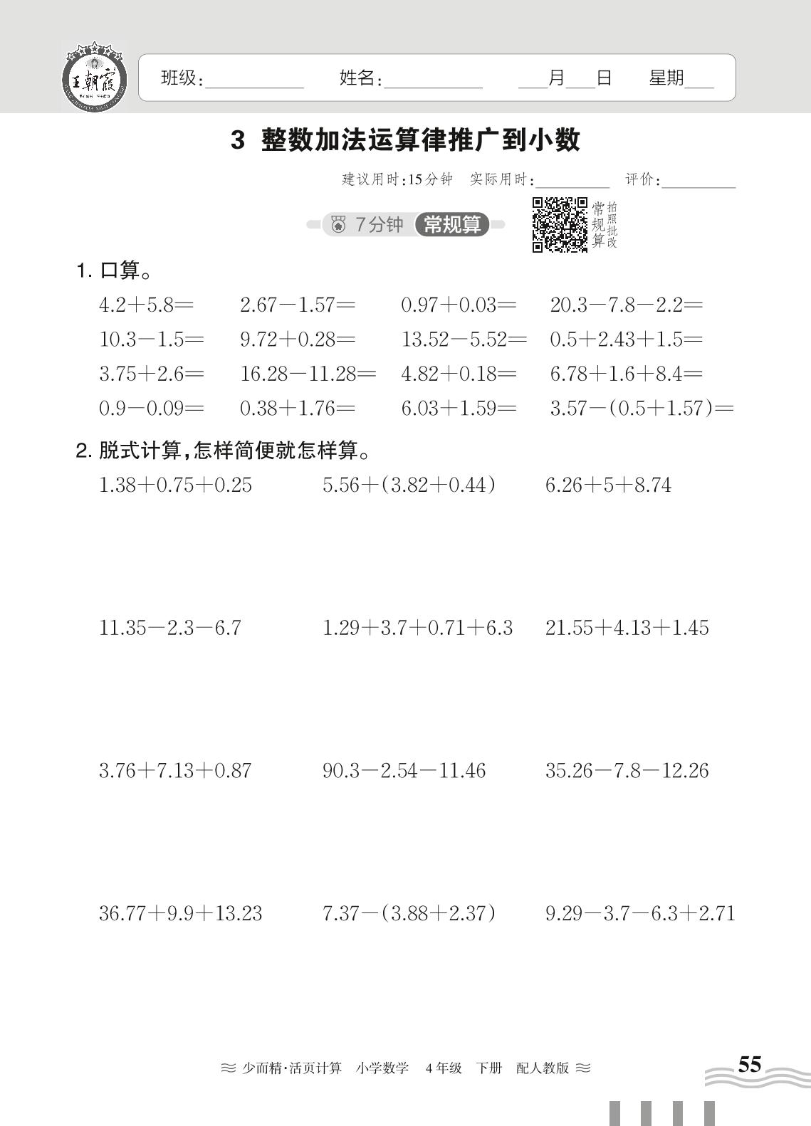 2024春下册四年级数学人教版 第六单元 小数的加法和减法——3. 整数加法运算律推广到小数
