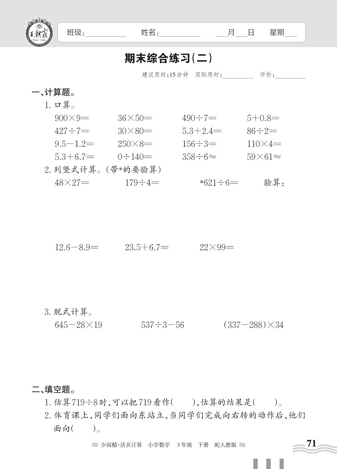 2024春下册三年级数学人教版 期末综合练习(二)(计算专练)