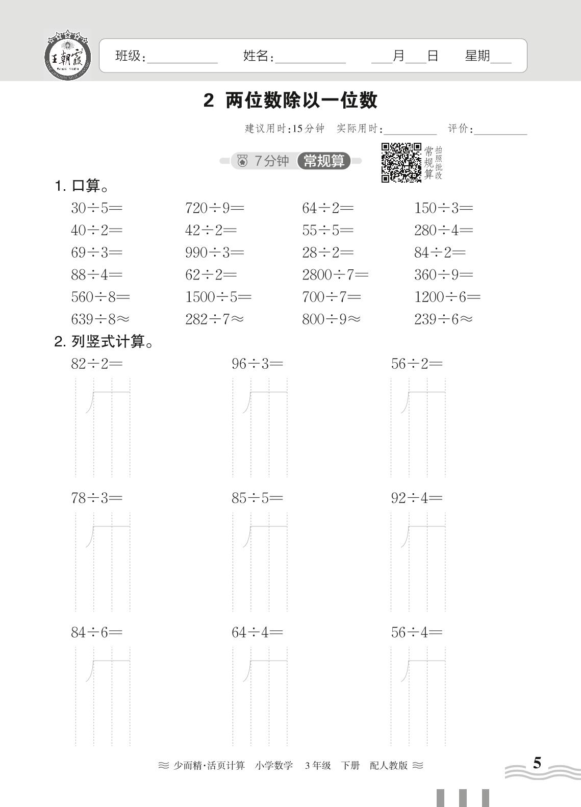 2024春下册三年级数学人教版 第二单元 除数是一位数的除法——2. 两位数除以一位数