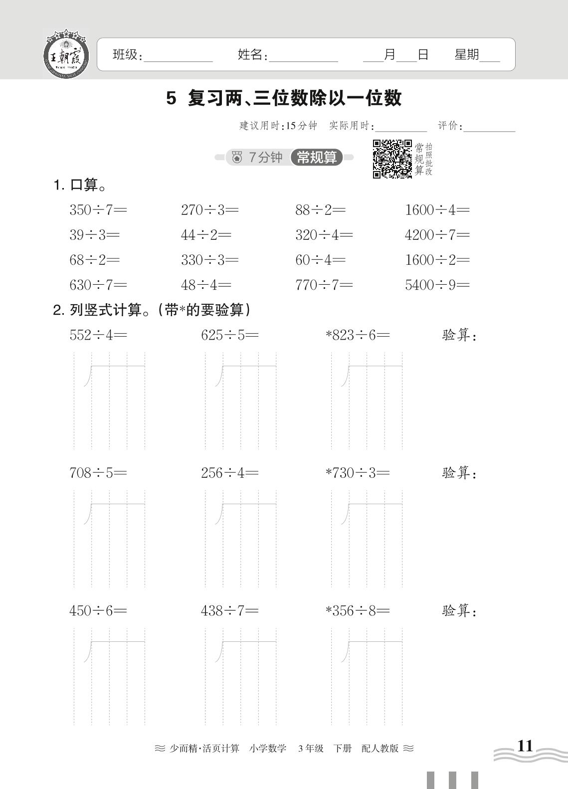 2024春下册三年级数学人教版 第二单元 除数是一位数的除法——5. 复习两、三位数除以一位数