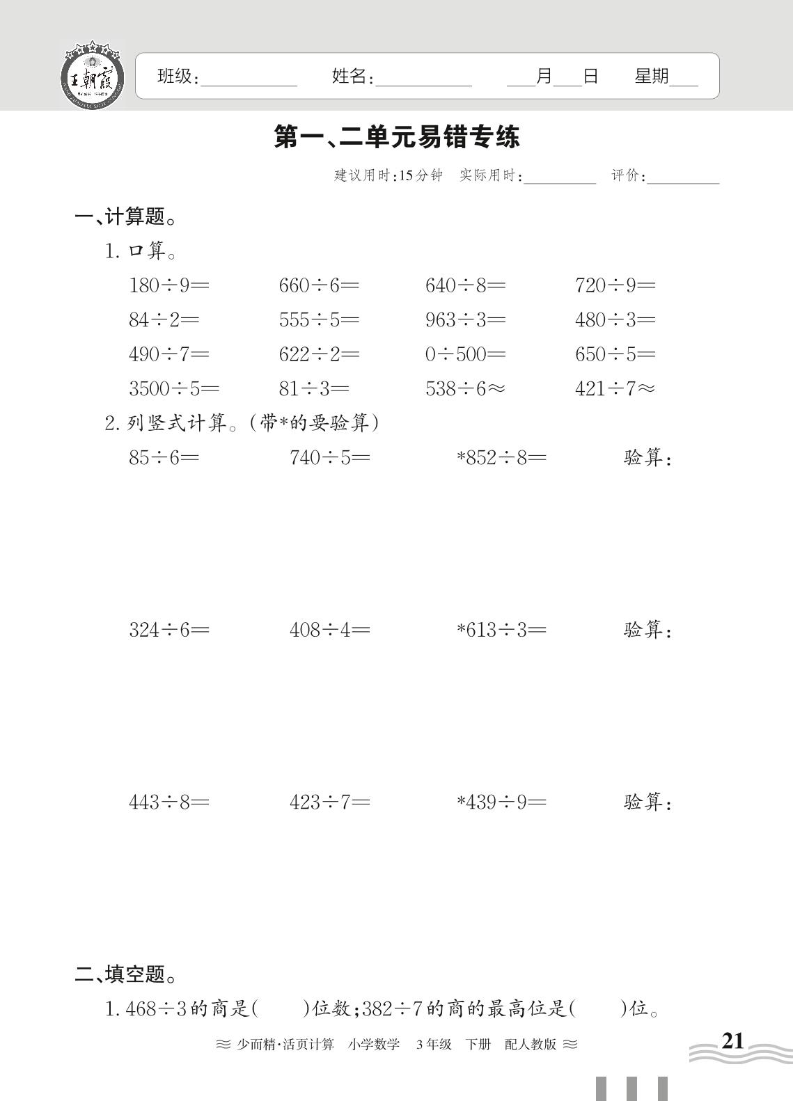 2024春下册三年级数学人教版 第一、二单元易错专练