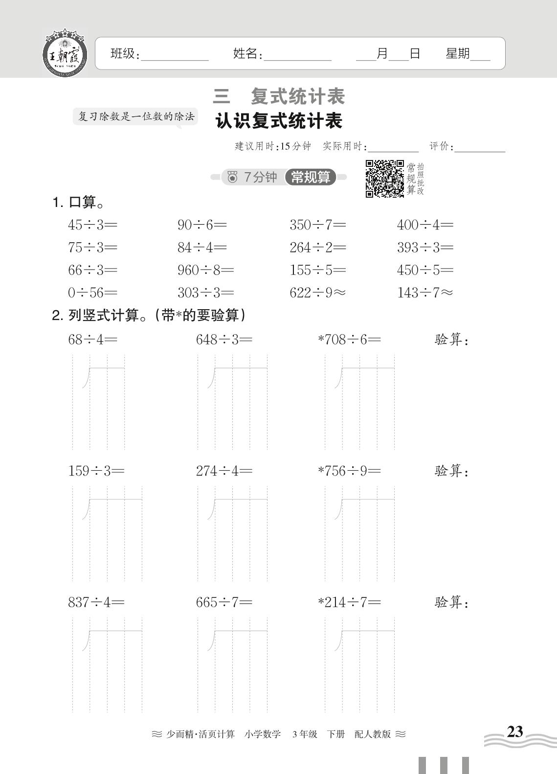 2024春下册三年级数学人教版 第三单元 复式统计表——认识复式统计表