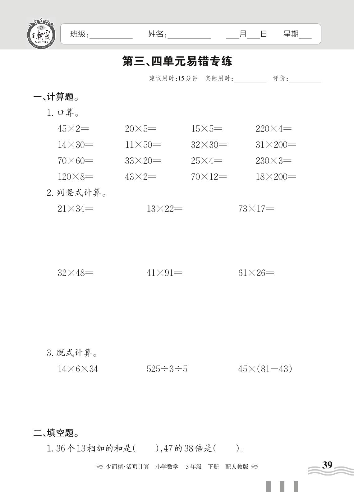 2024春下册三年级数学人教版 第三、四单元易错专练