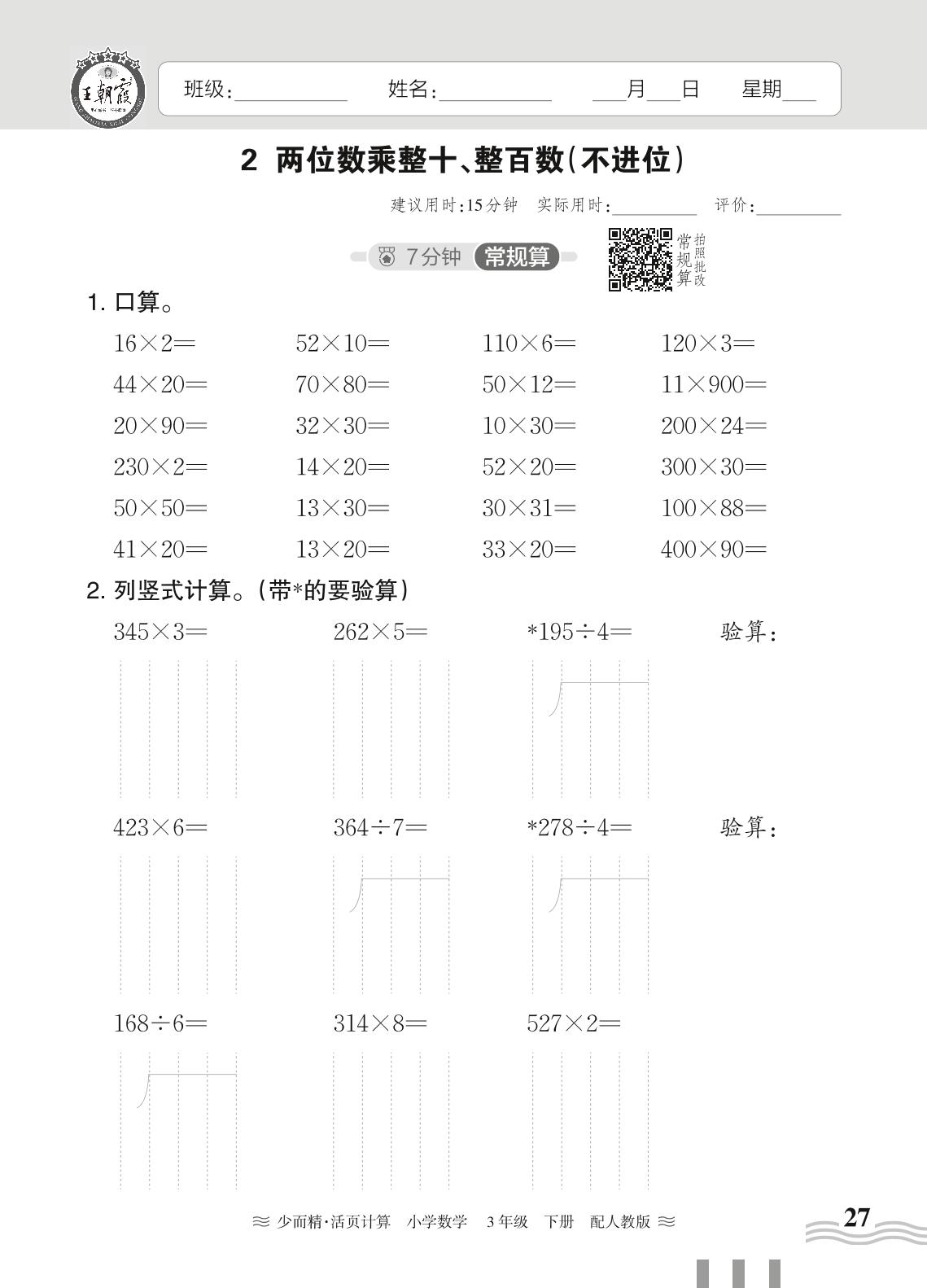 2024春下册三年级数学人教版 第四单元 两位数乘两位数——2. 两位数乘整十、整百数(不进位)