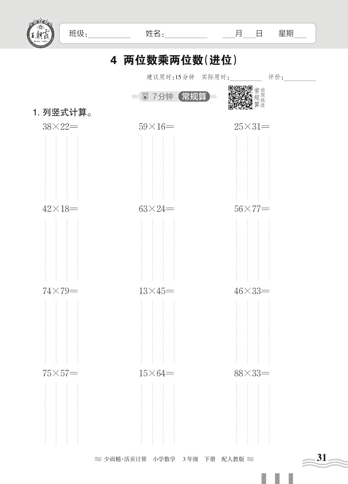 2024春下册三年级数学人教版 第四单元 两位数乘两位数——4. 两位数乘两位数(进位)