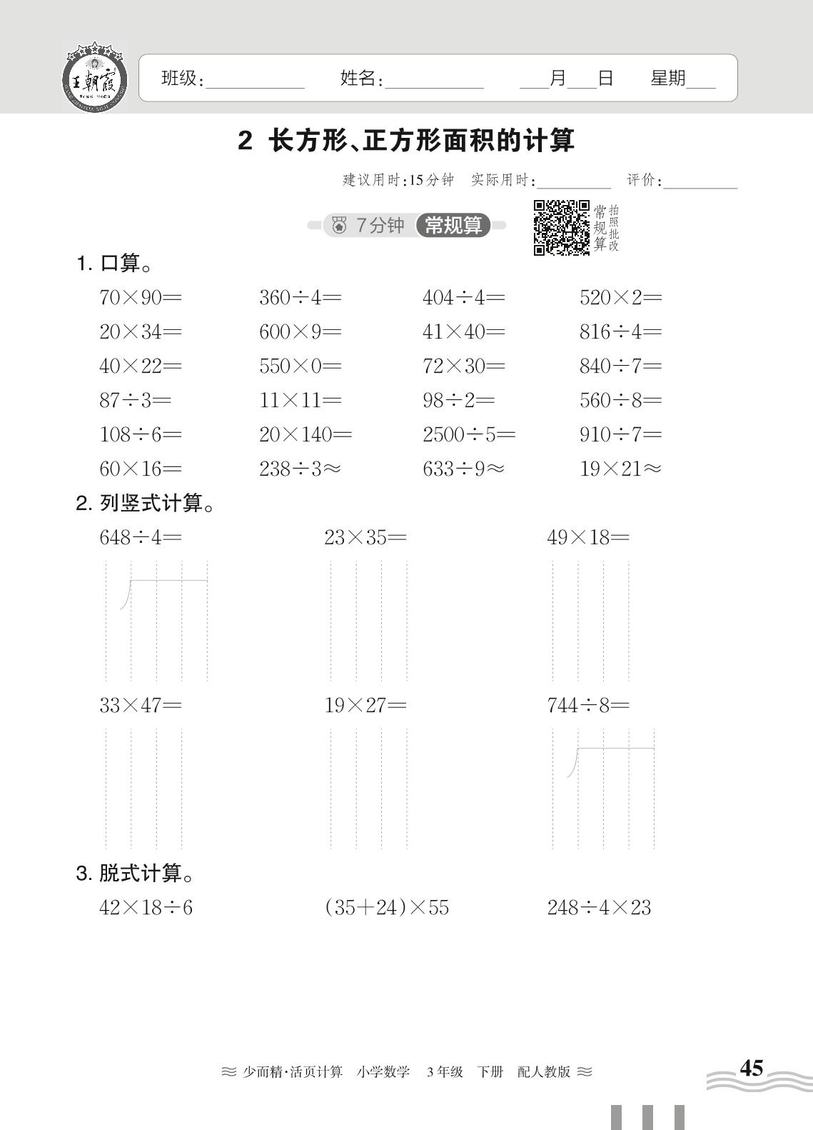 2024春下册三年级数学人教版 第五单元 面积——2. 长方形、正方形面积的计算