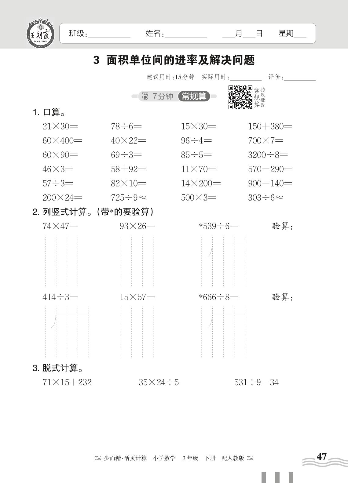 2024春下册三年级数学人教版 第五单元 面积——3. 面积单位间的进率及解决问题