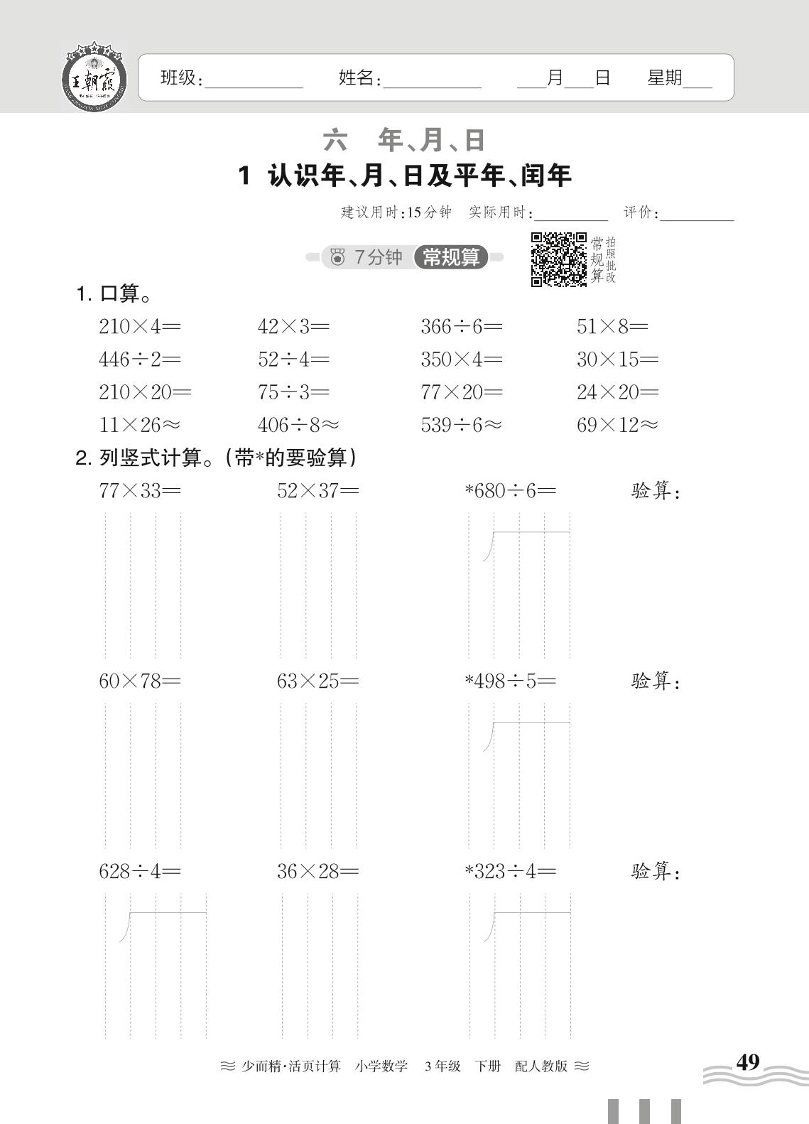 2024春下册三年级数学人教版 第六单元 年、月、日——1. 认识年、月、日及平年、闰年