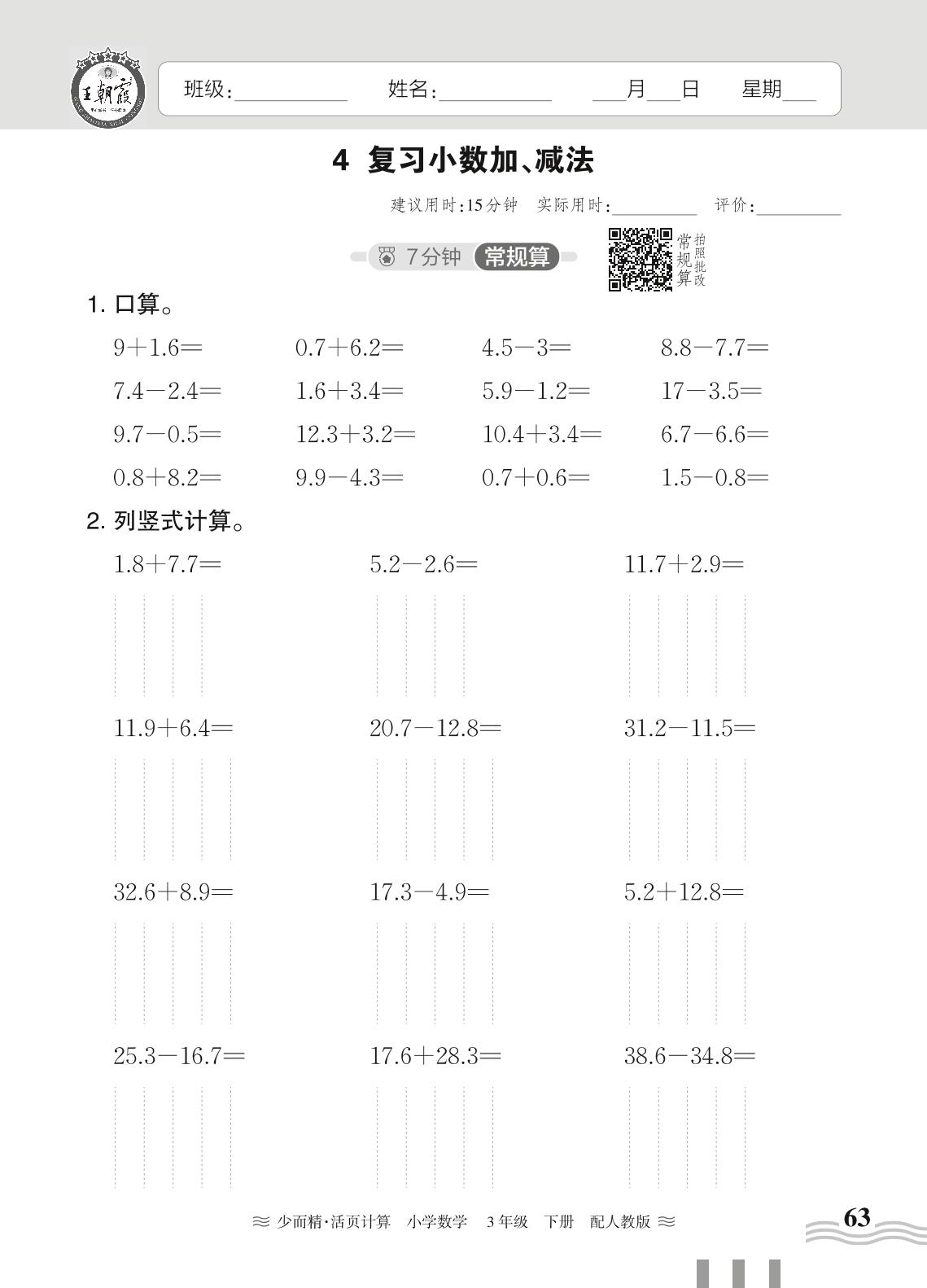 2024春下册三年级数学人教版 第七单元 小数的初步认识——4. 复习小数加、减法
