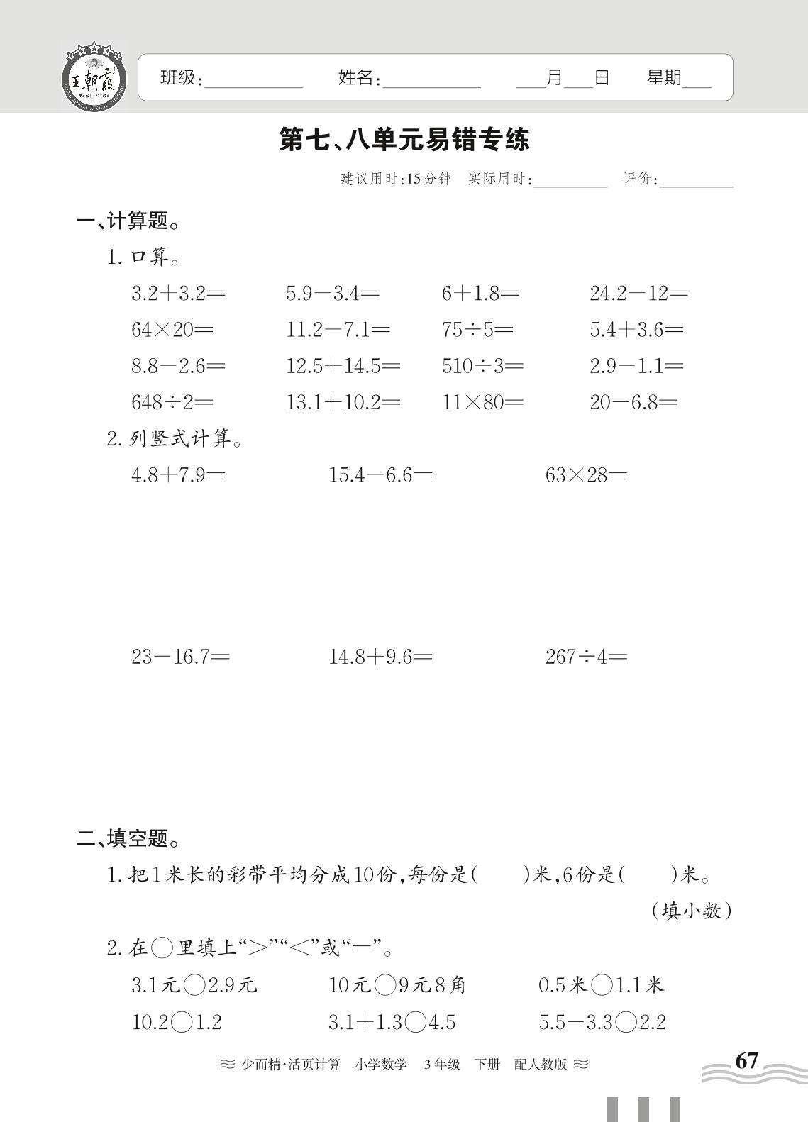 2024春下册三年级数学人教版 第七、八单元易错专练