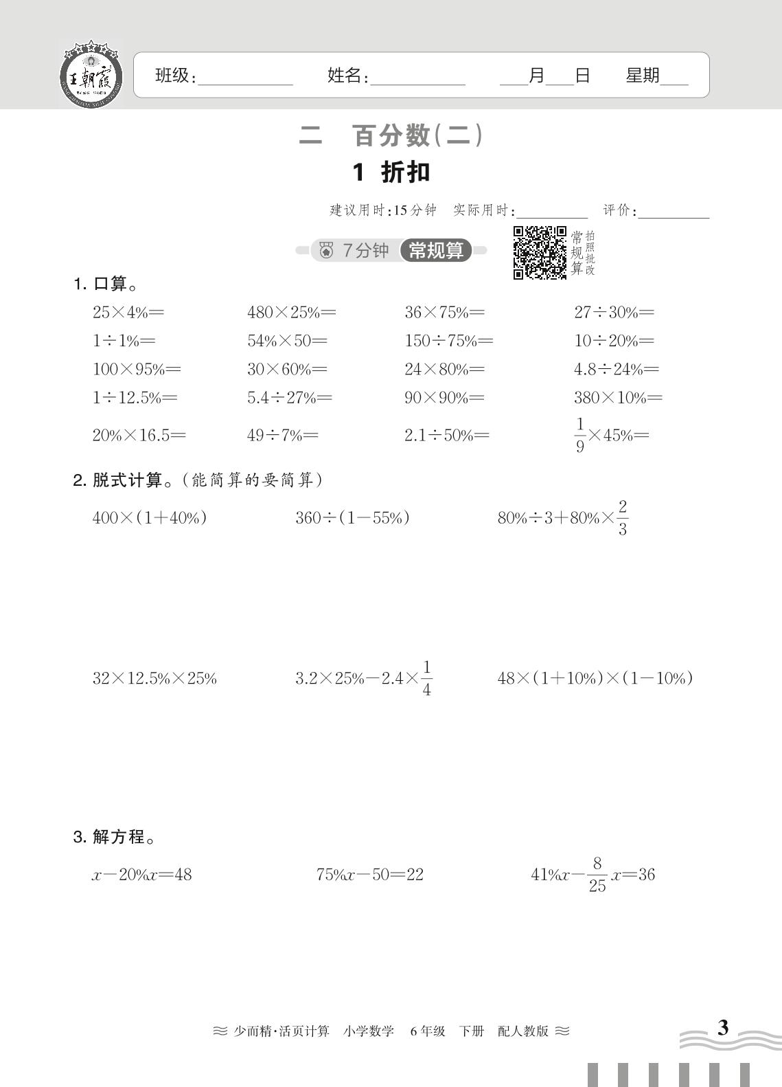 2024春下册六年级数学人教版 第二单元 百分数(二)——1. 折扣_R240124113553966