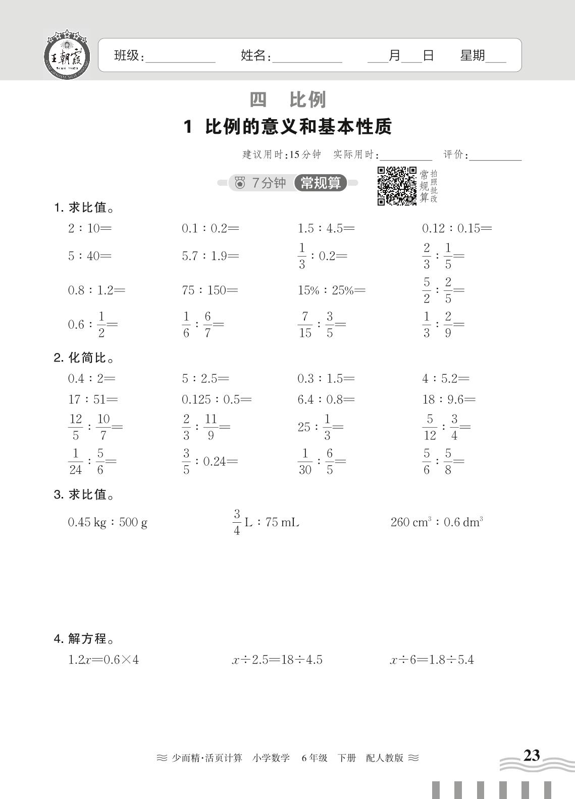 2024春下册六年级数学人教版 第四单元 比例——1. 比例的意义和基本性质
