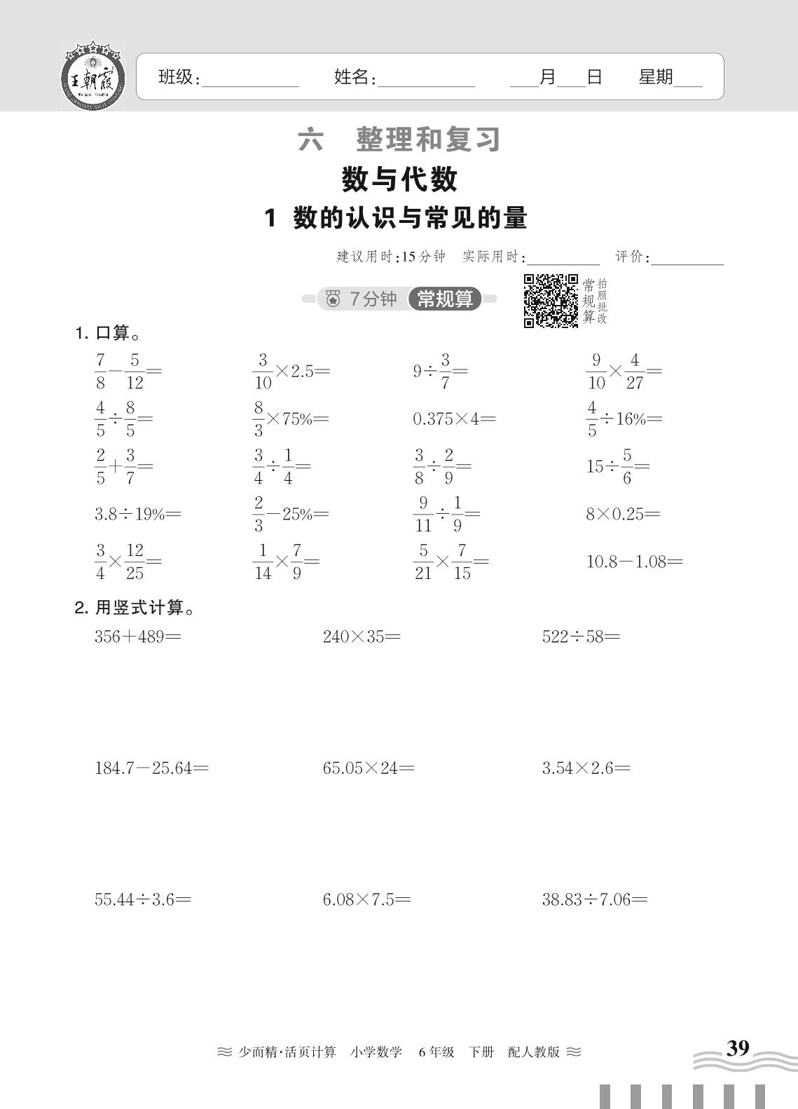2024春下册六年级数学人教版 第六单元 整理和复习(数与代数)——1. 数的认识与常见的量