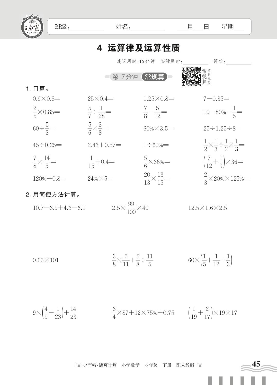 2024春下册六年级数学人教版 第六单元 整理和复习(数与代数)——4. 运算律及运算性质
