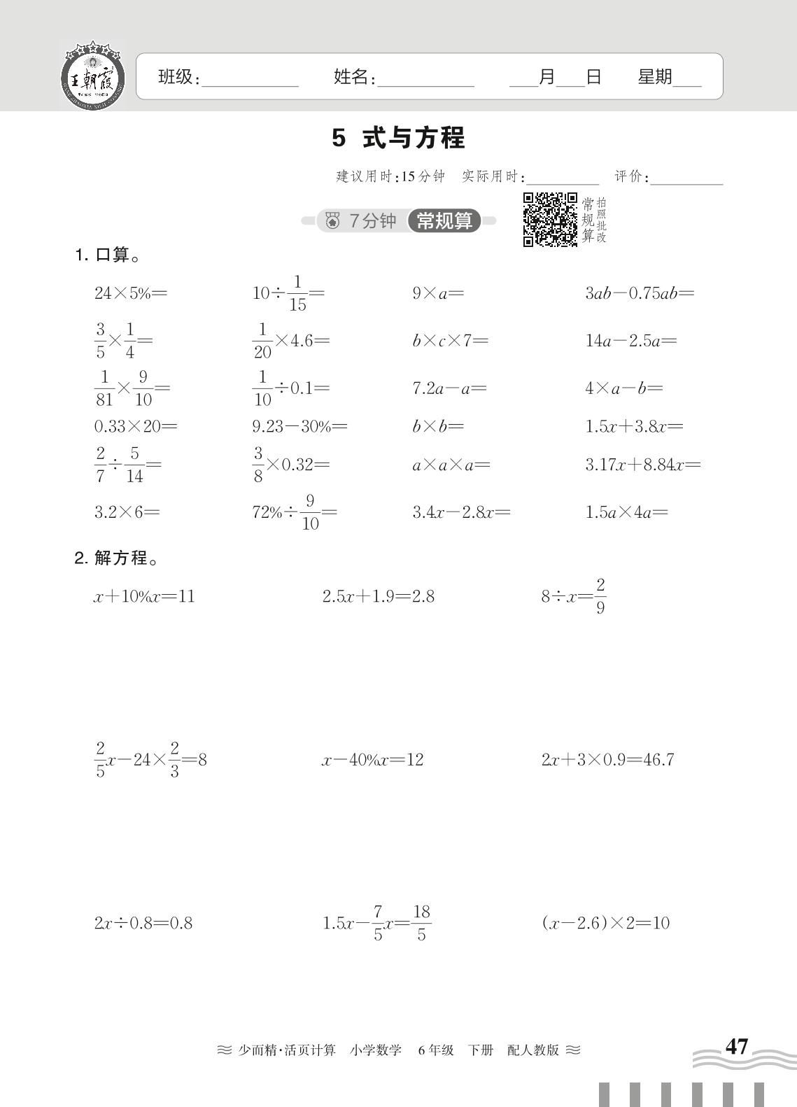 2024春下册六年级数学人教版 第六单元 整理和复习(数与代数)——5. 式与方程