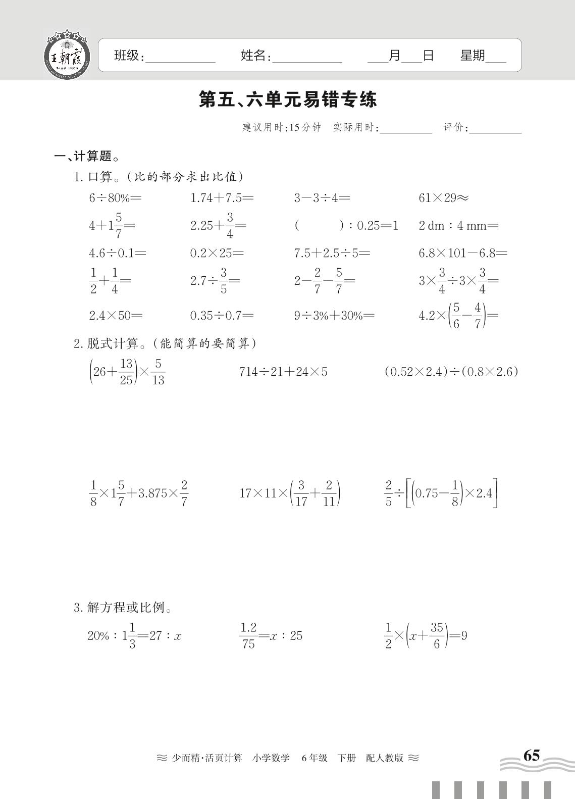 2024春下册六年级数学人教版 第五、六单元易错专练