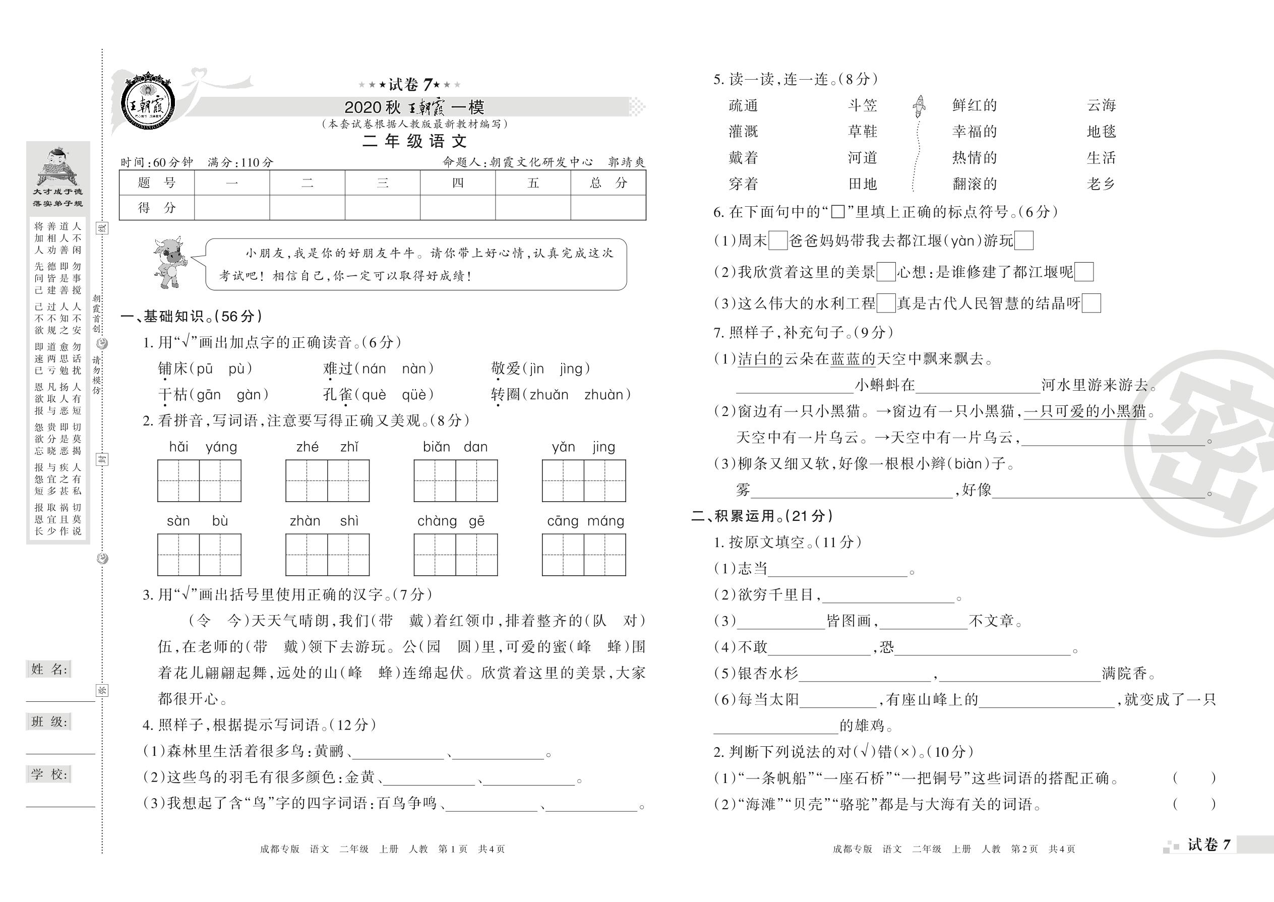 王朝霞期末模拟卷二年级上册语文(人教版)_R21080164841【7】