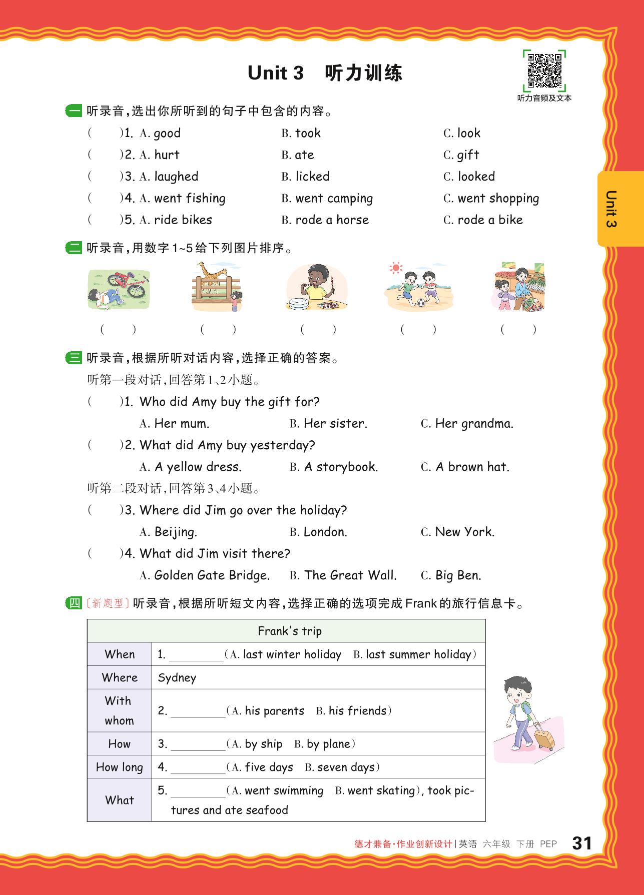 2024春下册六年级英语人教PEP版 Unit 3 听力训练