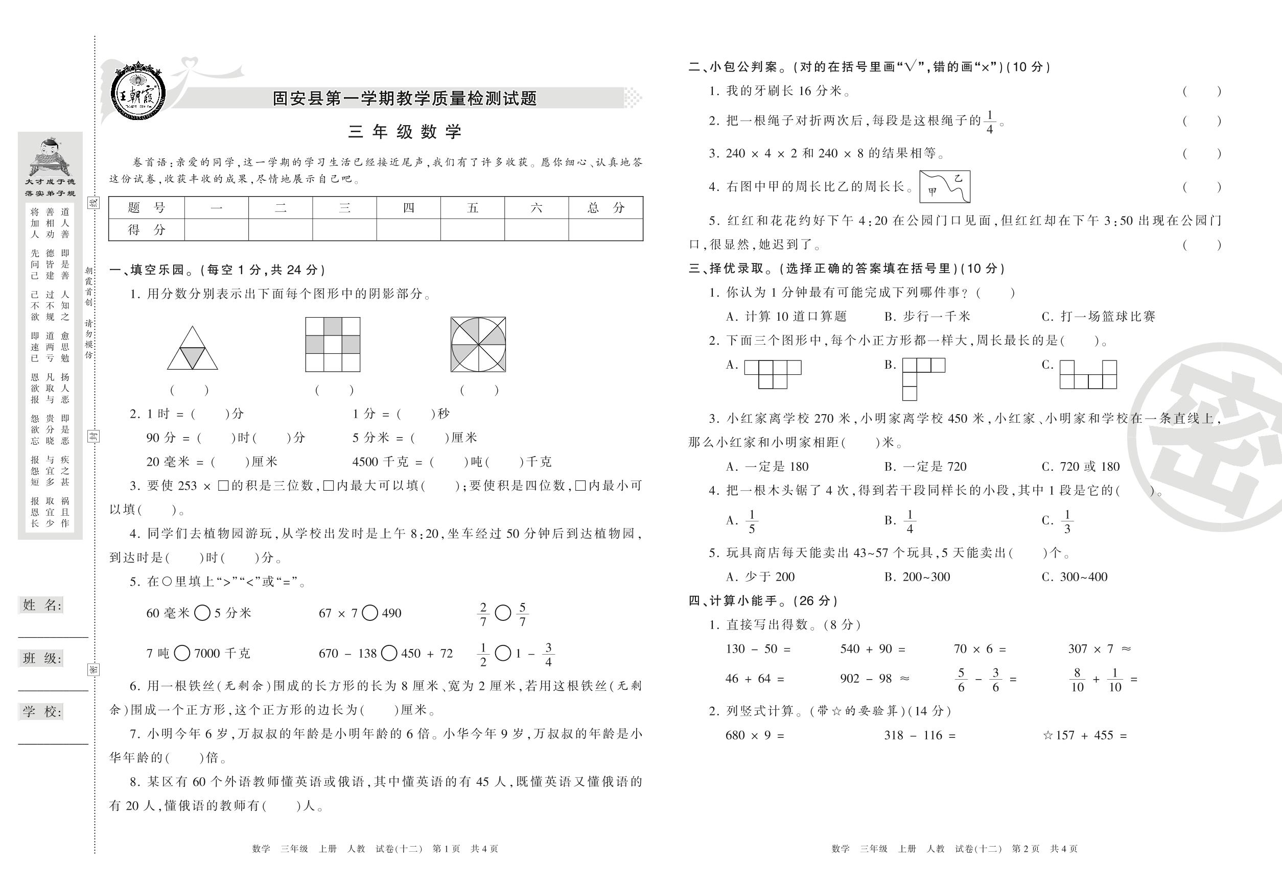 2016-2017学年第一学期廊坊市固安县三年级数学试卷(人教版)【12】