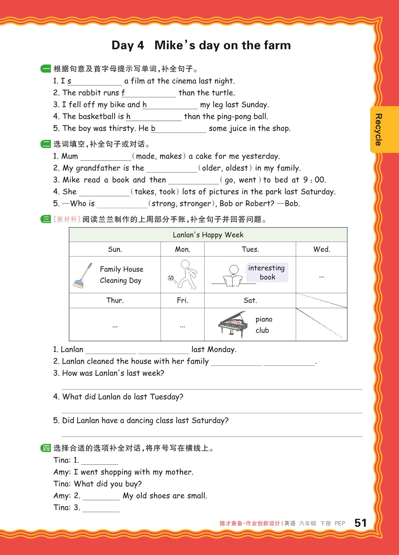 2024春下册六年级英语人教PEP版 Recycle—Day 4 Mike’s day on the farm