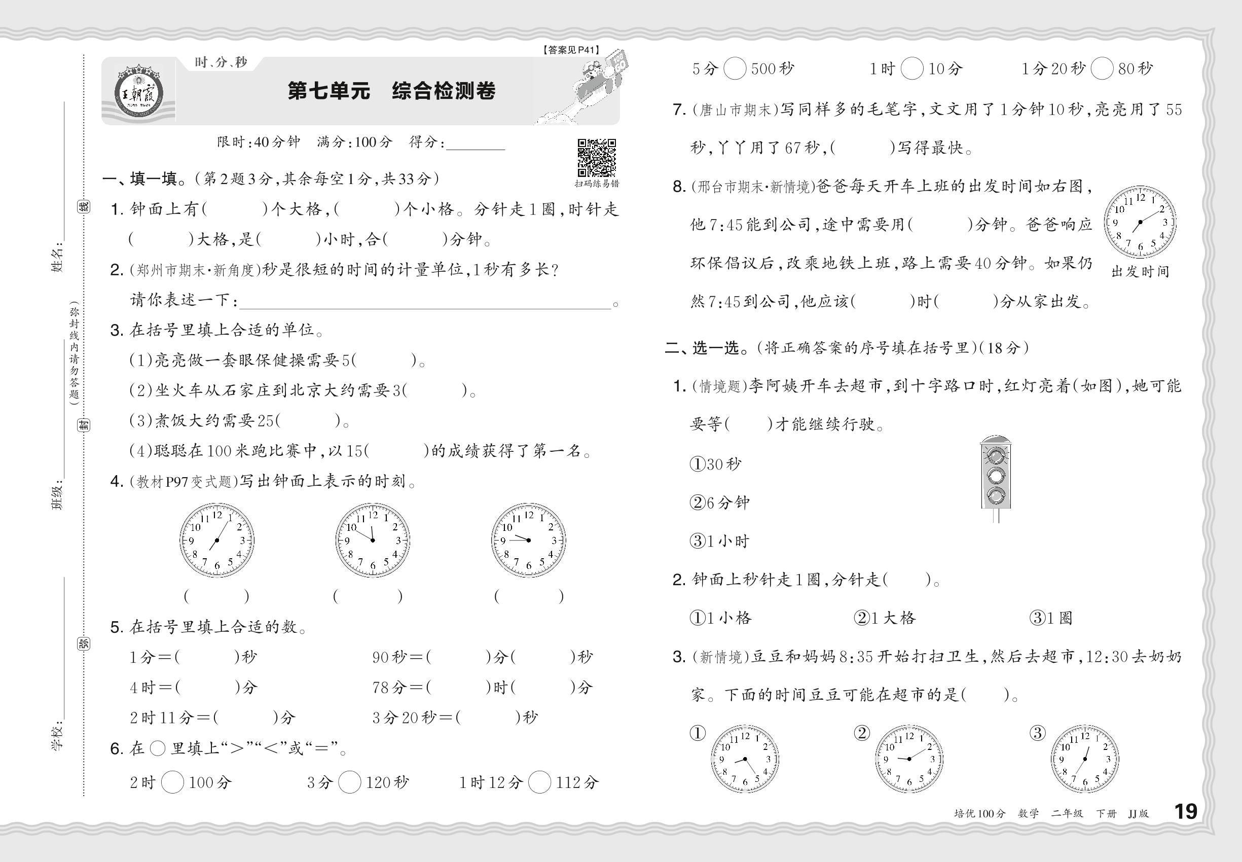 2024春下册二年级数学冀教版 第七单元 综合检测卷