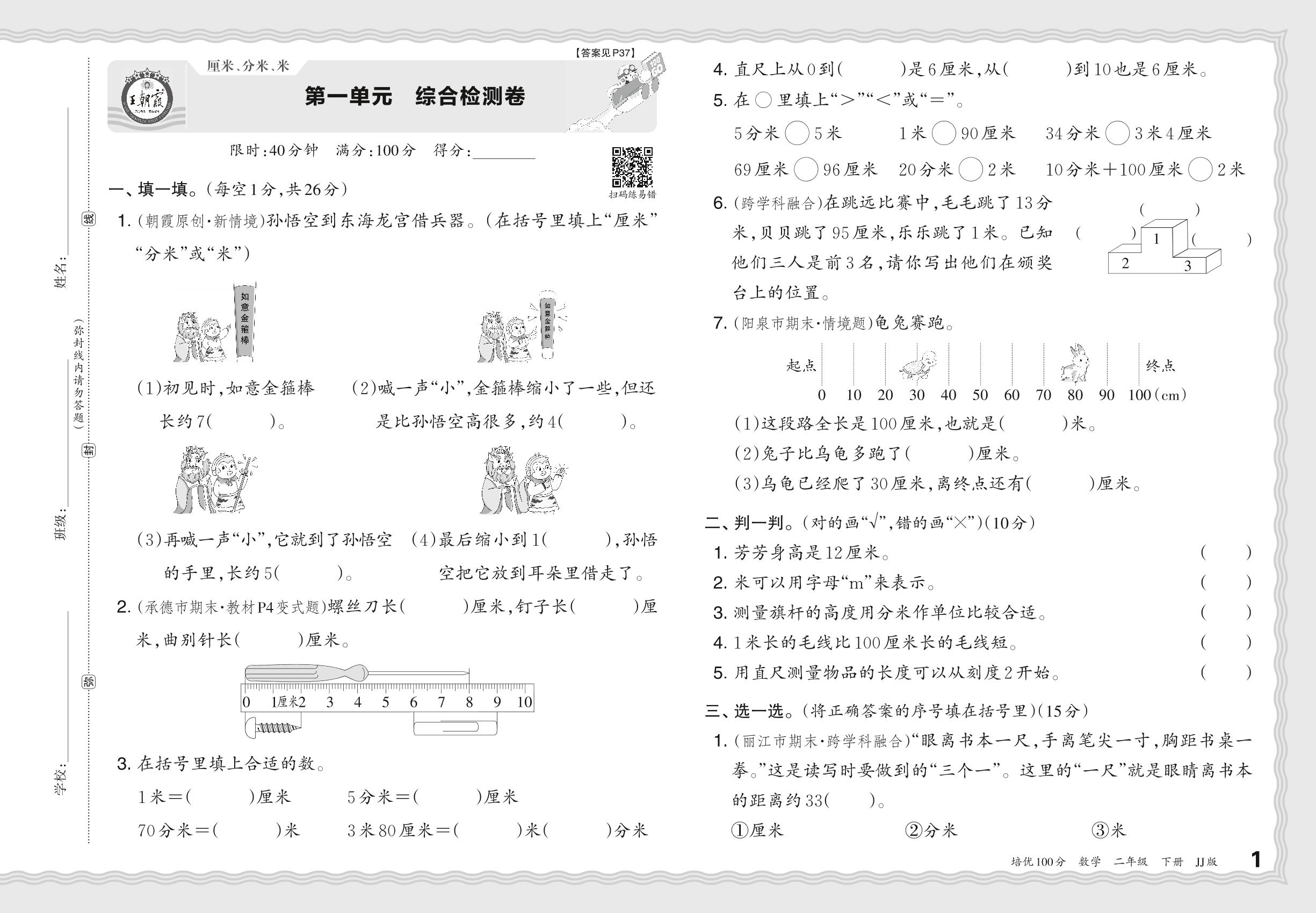 2024春下册二年级数学冀教版 第一单元 综合检测卷