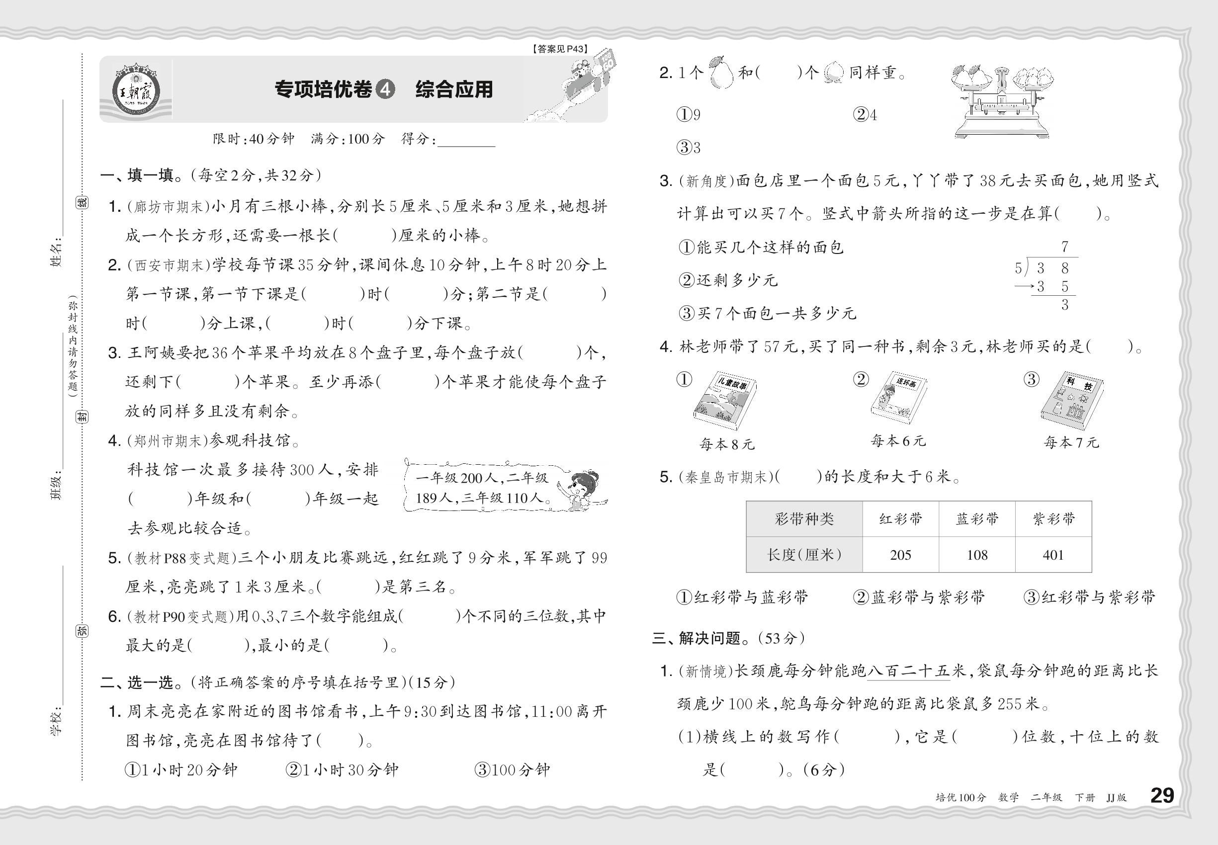 2024春下册二年级数学冀教版 期末专项卷PY版·综合应用【4】