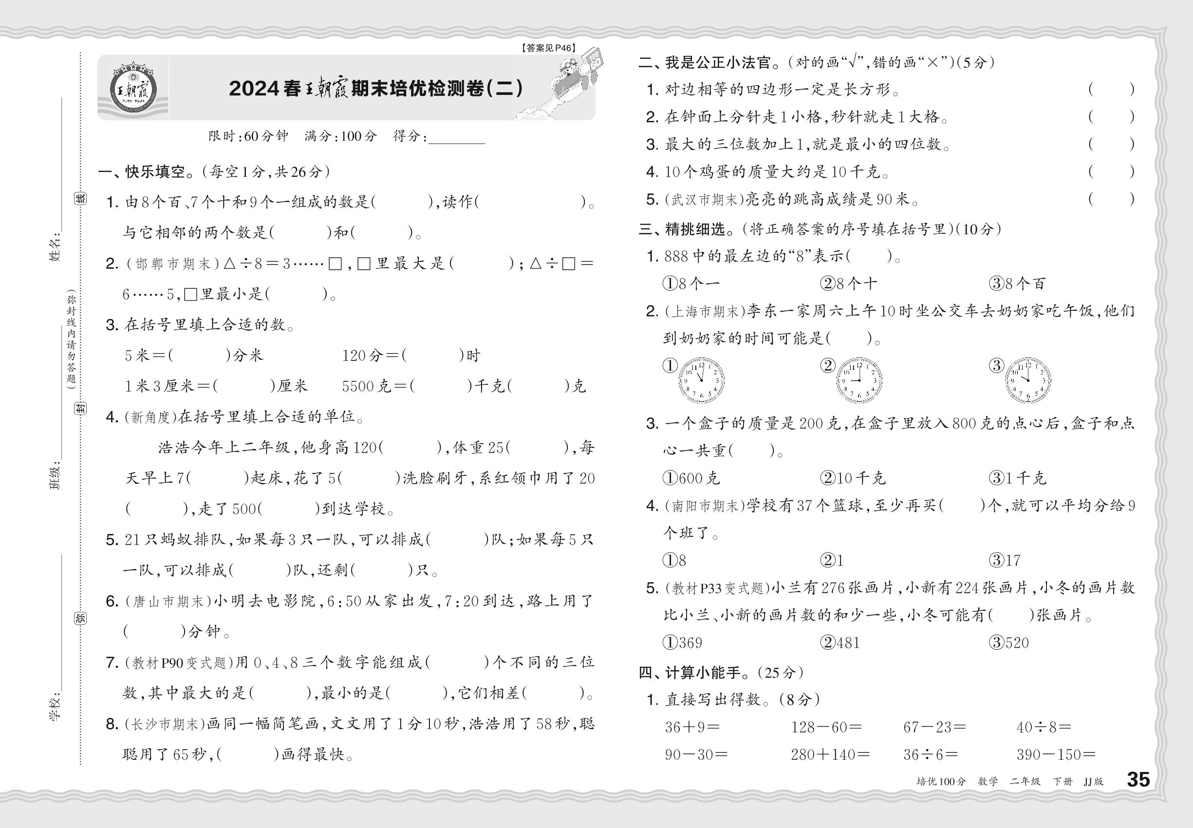 2024春下册二年级数学冀教版 王朝霞期末培优检测卷(二)