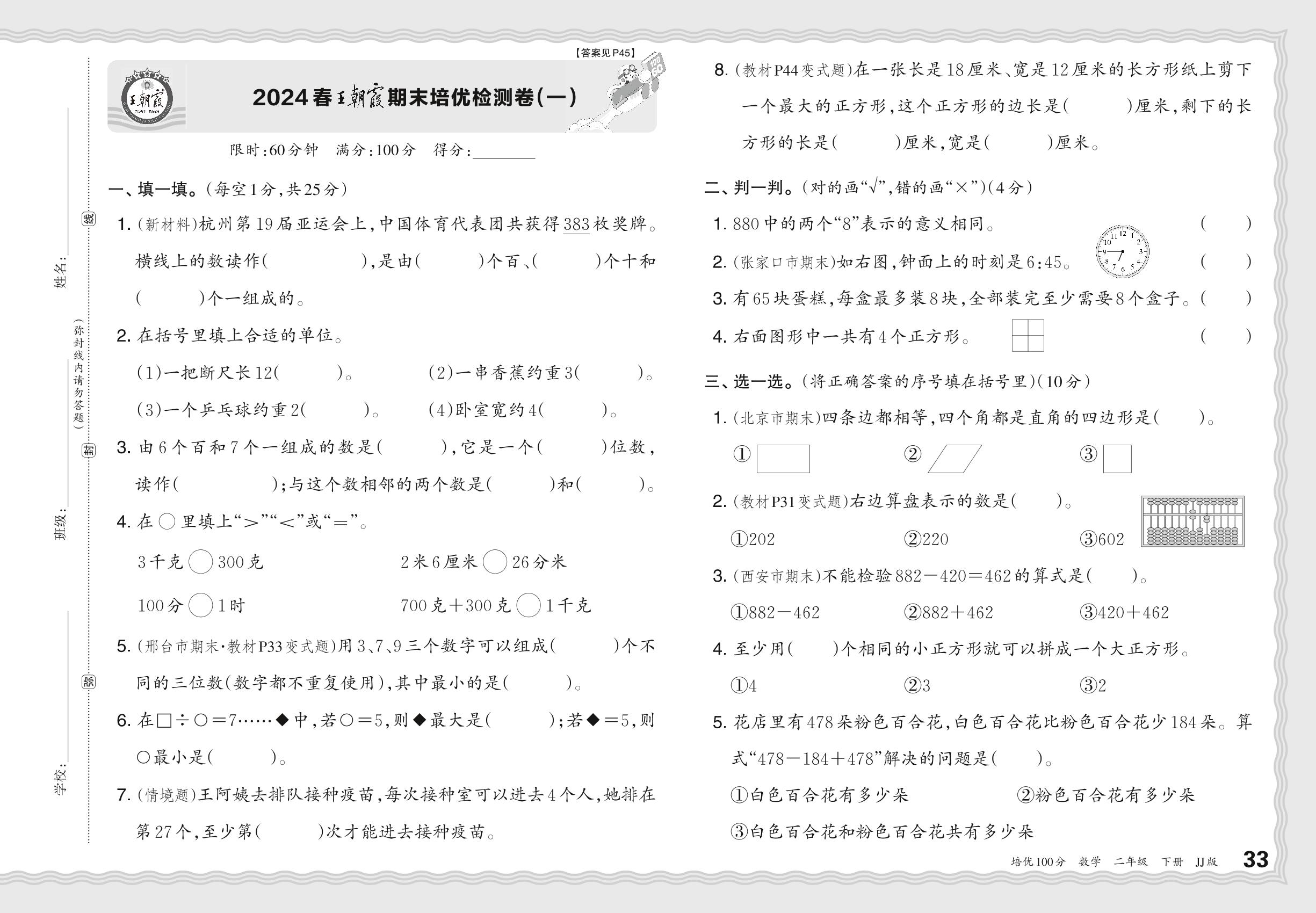 2024春下册二年级数学冀教版 王朝霞期末培优检测卷(一)