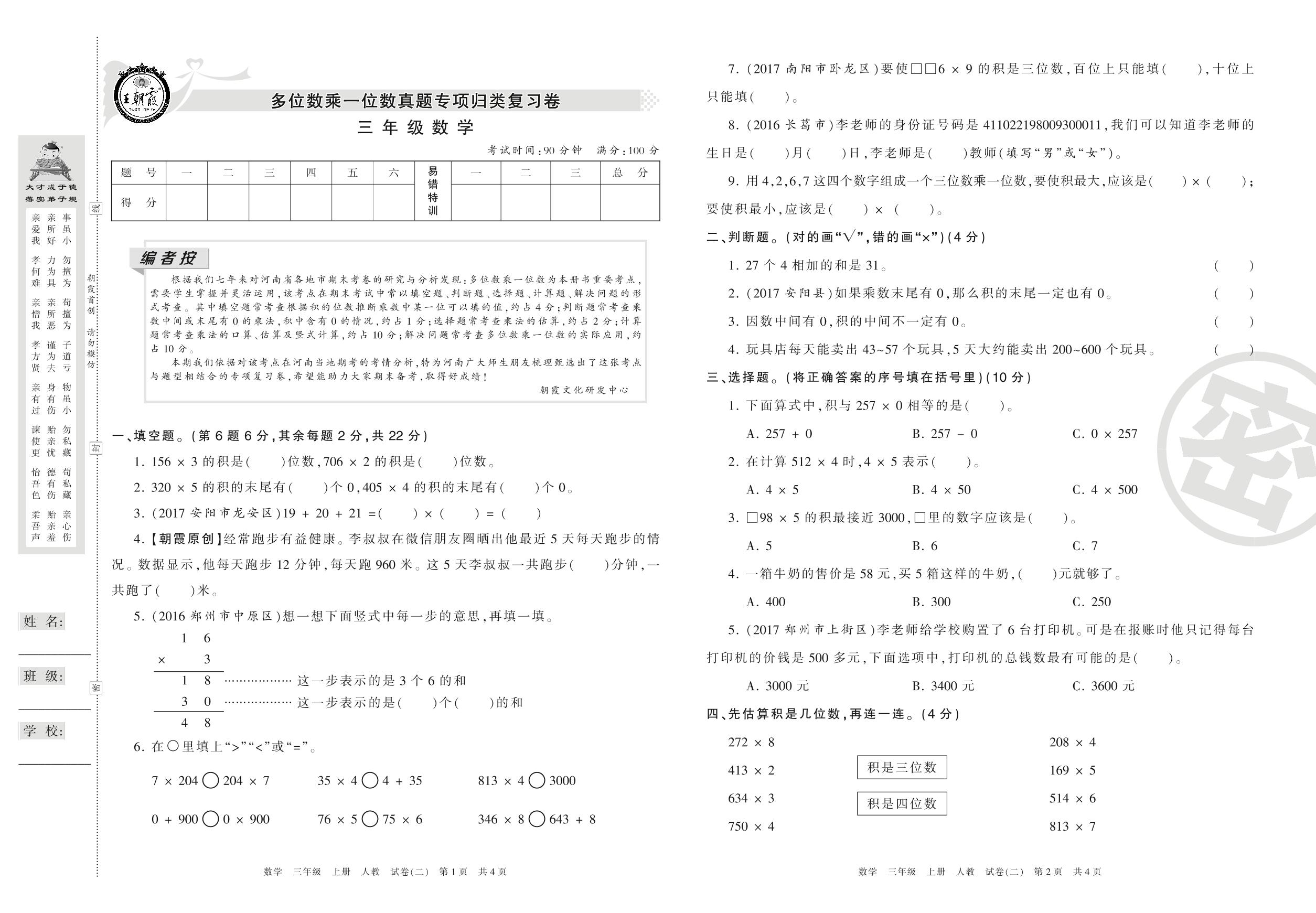 王朝霞期末专项卷三年级上册数学(人教版)_R210804104847【2】
