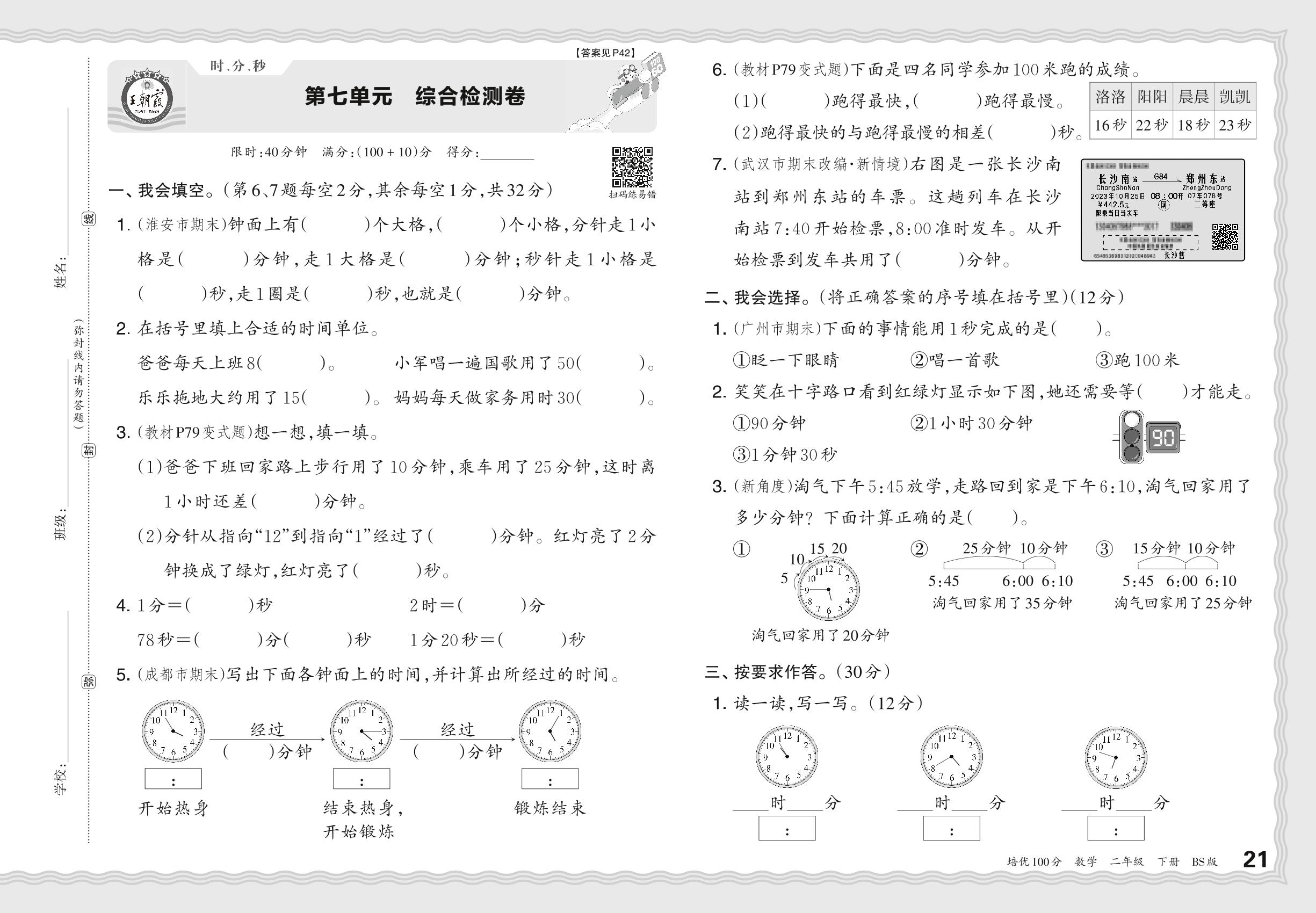 2024春下册二年级数学北师版 第七单元 综合检测卷