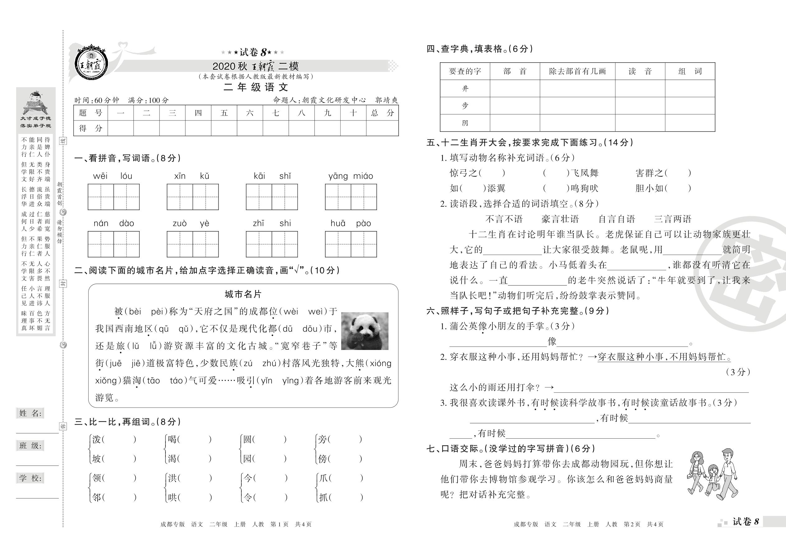 王朝霞期末模拟卷二年级上册语文(人教版)_R21080164845【8】
