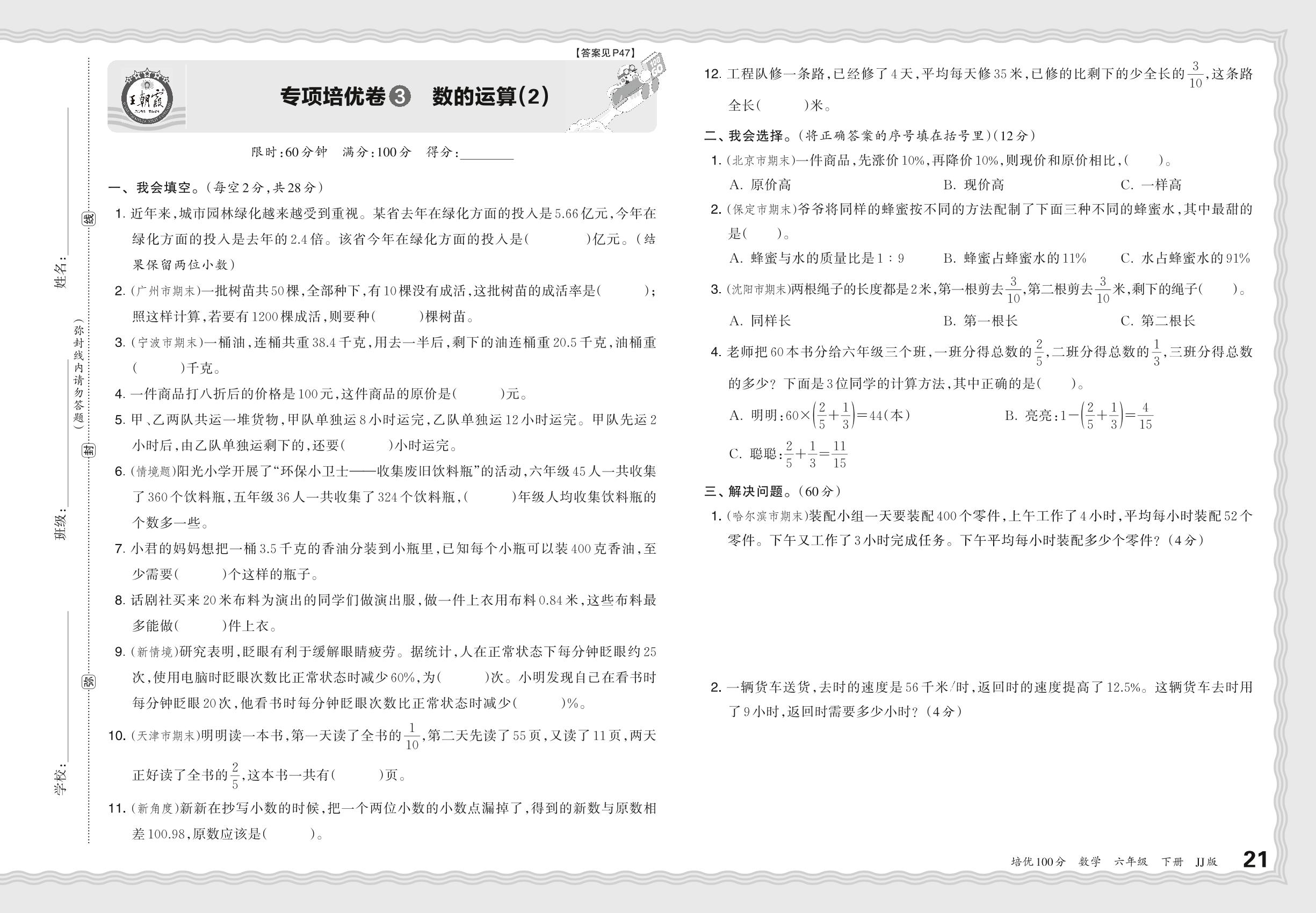 2024春下册六年级数学冀教版 期末专项卷PY版·数的运算(2)【3】