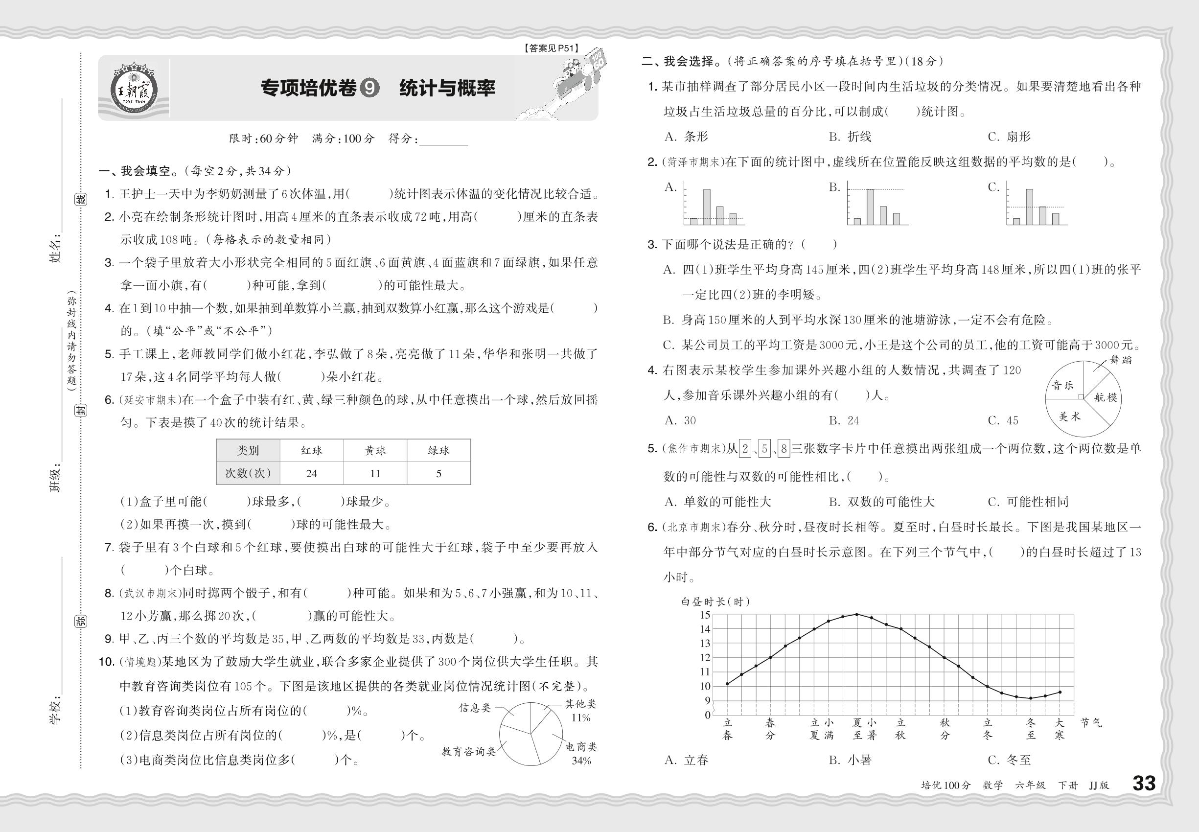2024春下册六年级数学冀教版 期末专项卷PY版·统计与概率【9】