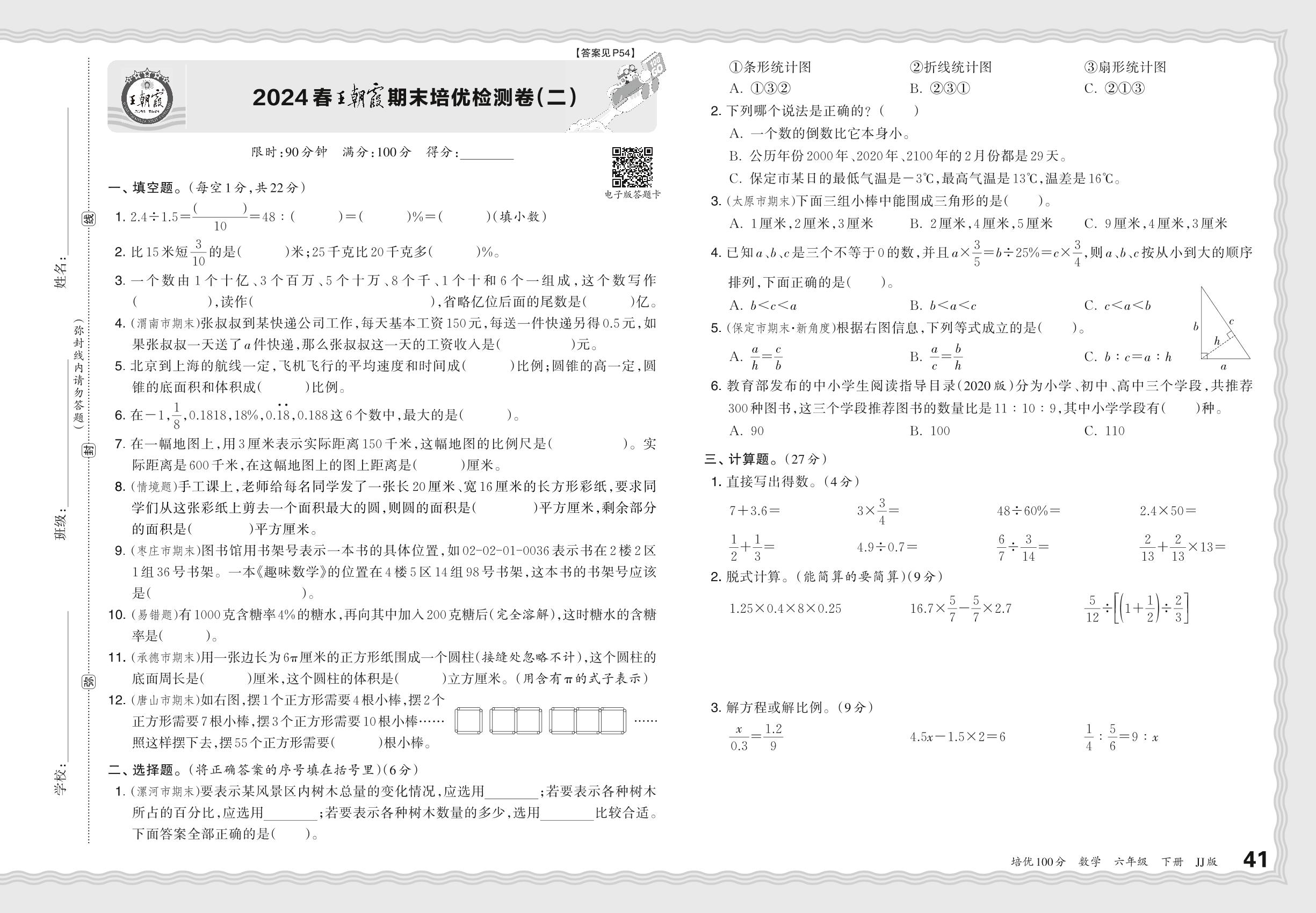 2024春下册六年级数学冀教版 王朝霞期末培优检测卷(二)