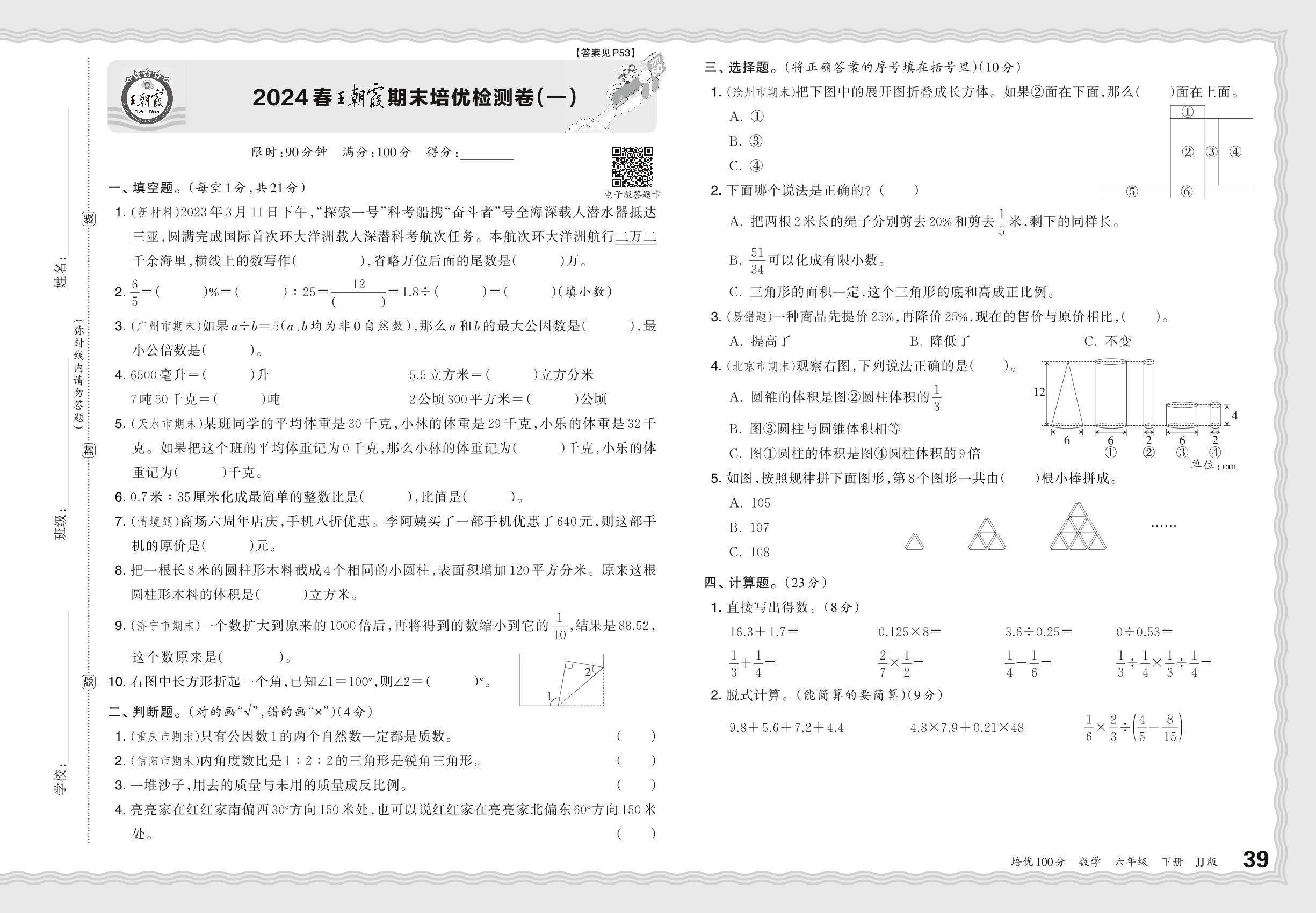 2024春下册六年级数学冀教版 王朝霞期末培优检测卷(一)