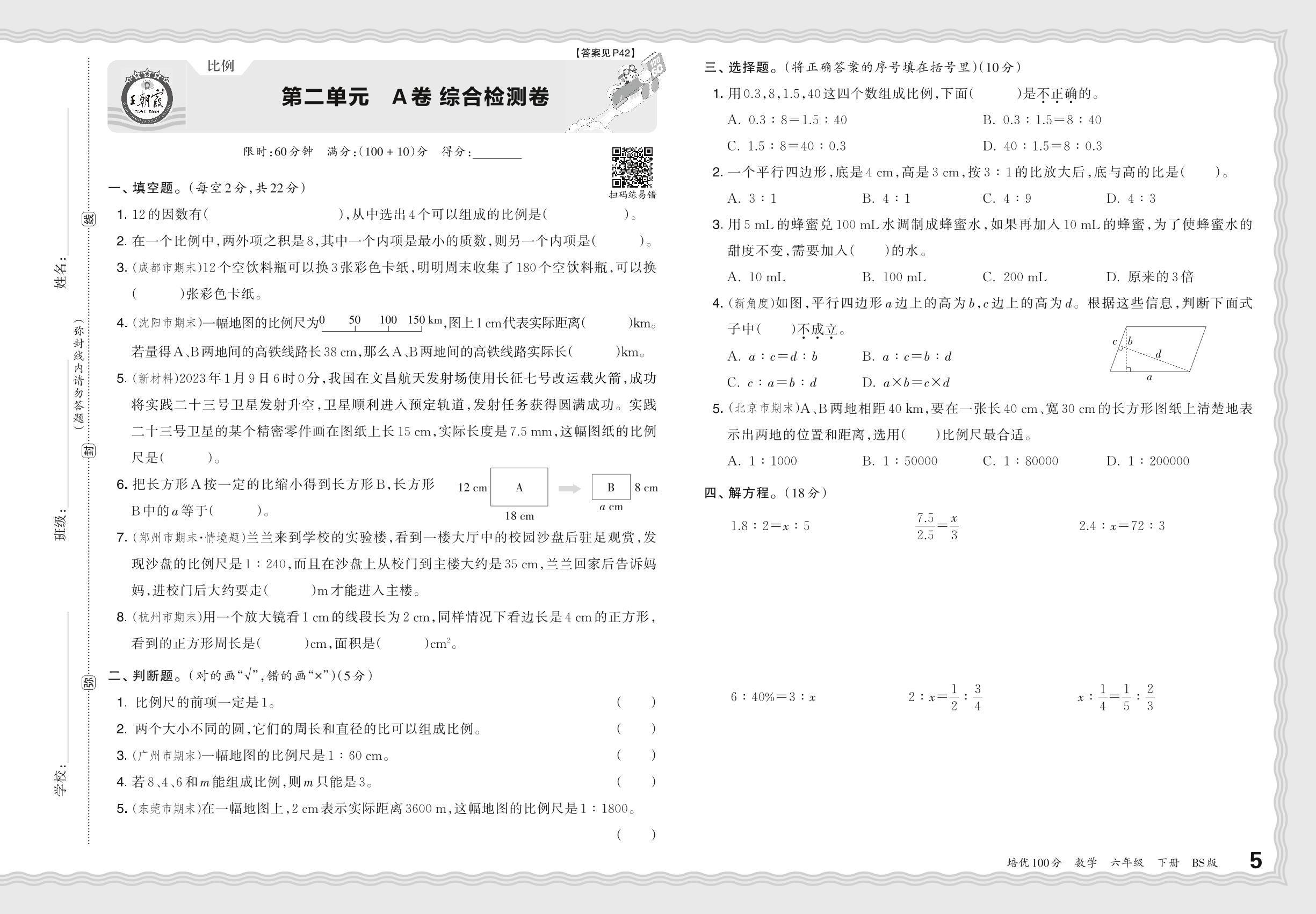 2024春下册六年级数学北师版 第二单元 A卷 综合检测卷