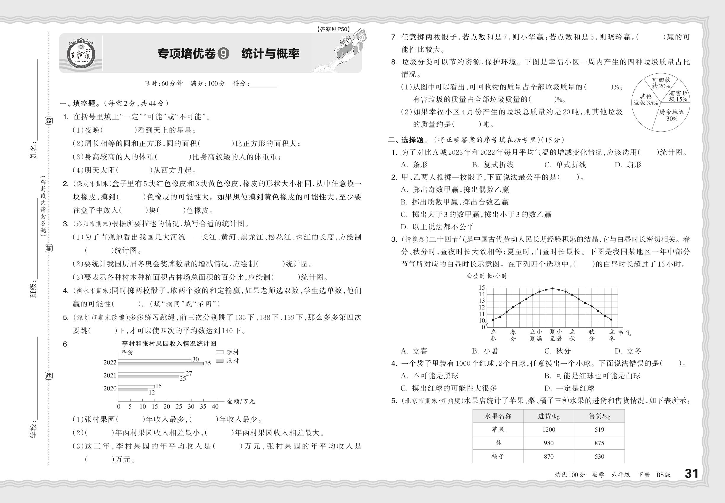 2024春下册六年级数学北师版 期末专项卷PY版·统计与概率【9】