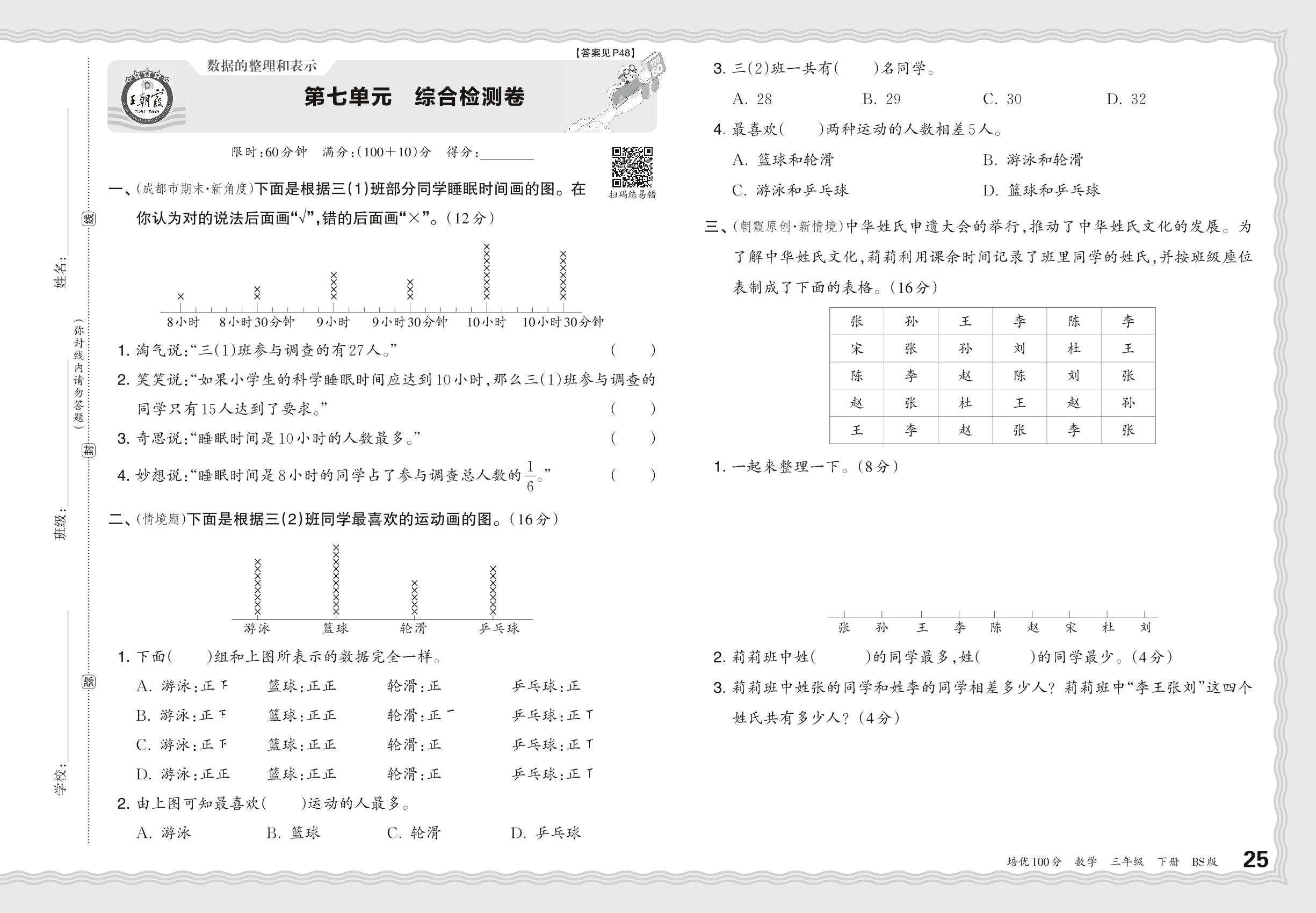 2024春下册三年级数学北师版 第七单元 综合检测卷
