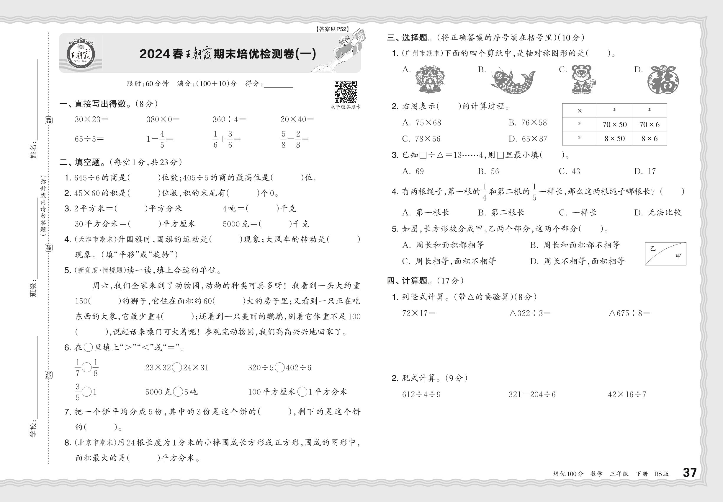 2024春下册三年级数学北师版 王朝霞期末培优检测卷(一)