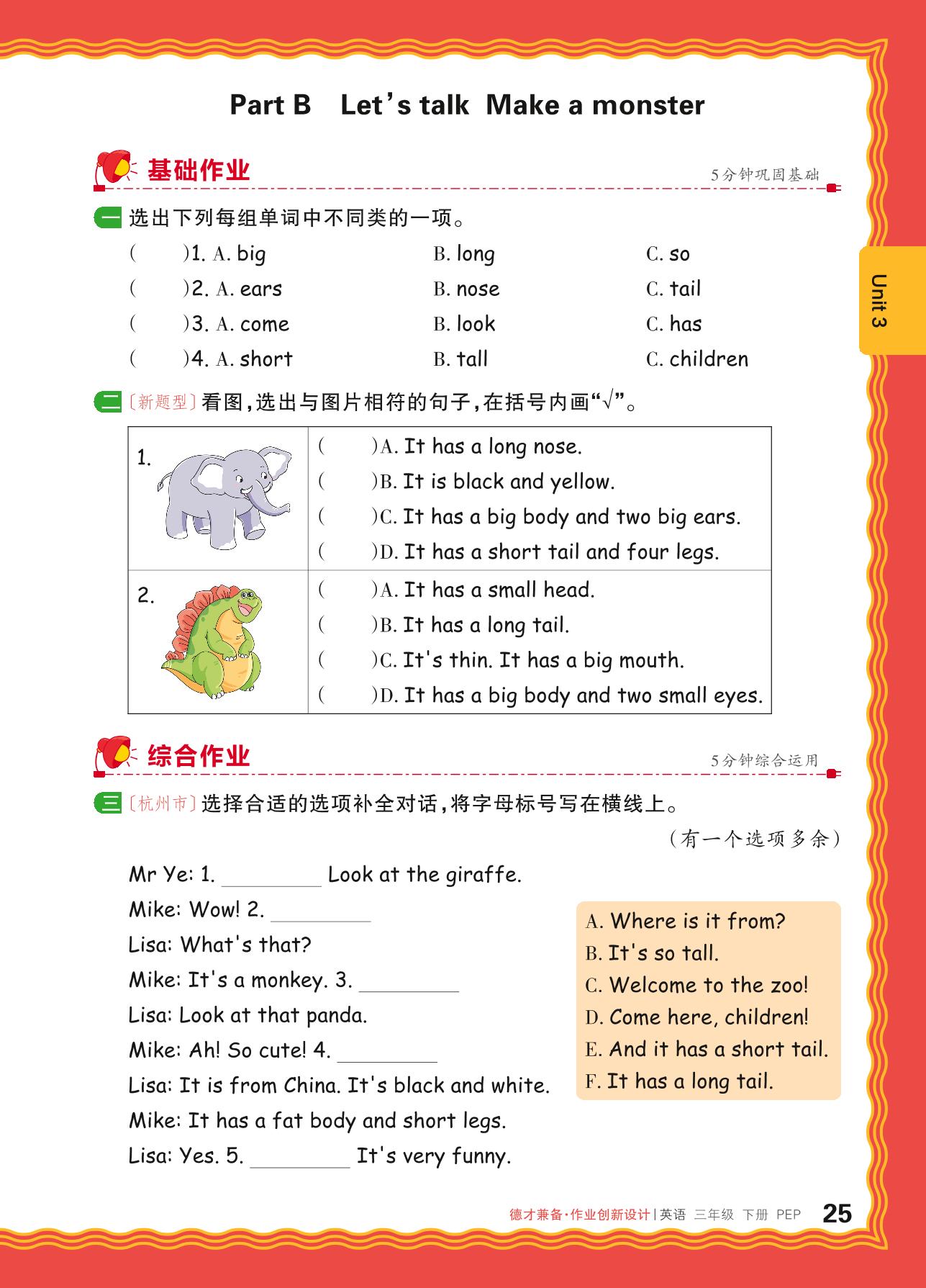 2024春下册三年级英语人教PEP版 Unit 3—Part B Let’s talk Make a monster