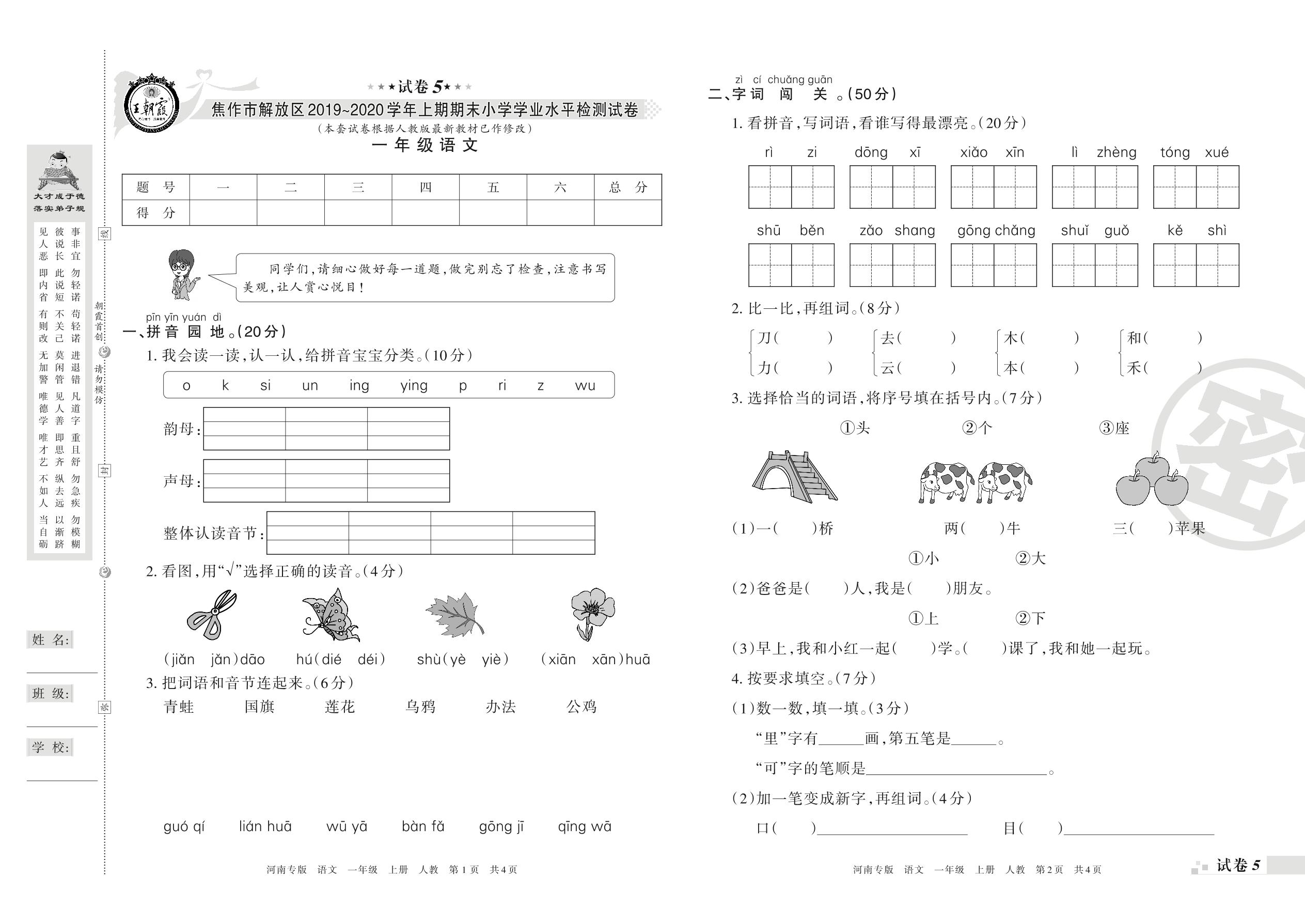2019-2020学年第一学期焦作市解放区一年级语文试卷(人教版)【5】