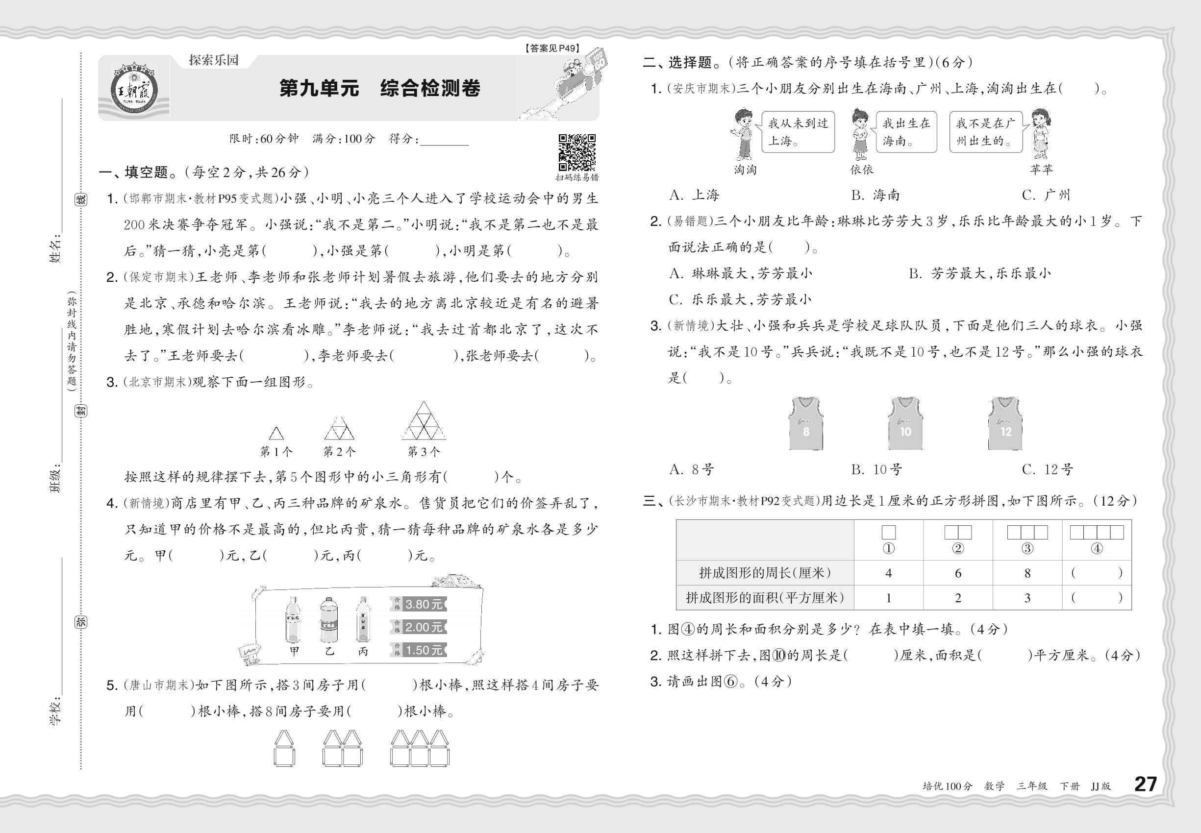 2024春下册三年级数学冀教版 第九单元 综合检测卷